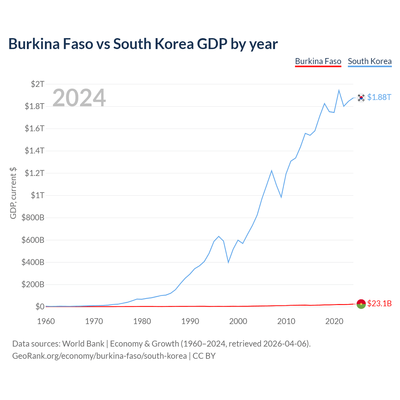 Burkina Faso has a GDP of $23.1B compared to $1.88T for South Korea, ranking 122/197 and 12/197 by economy size, respectively.