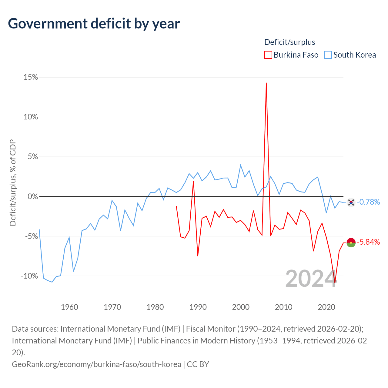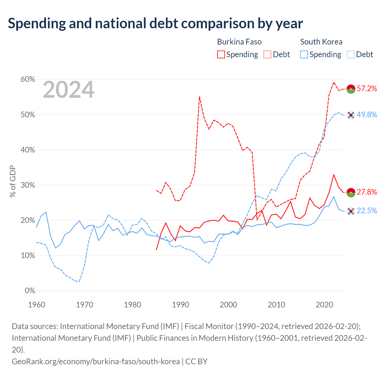 Burkina Faso has $13.2B in government debt (57.2% of GDP), compared to $934B (49.8% of GDP) in South Korea.