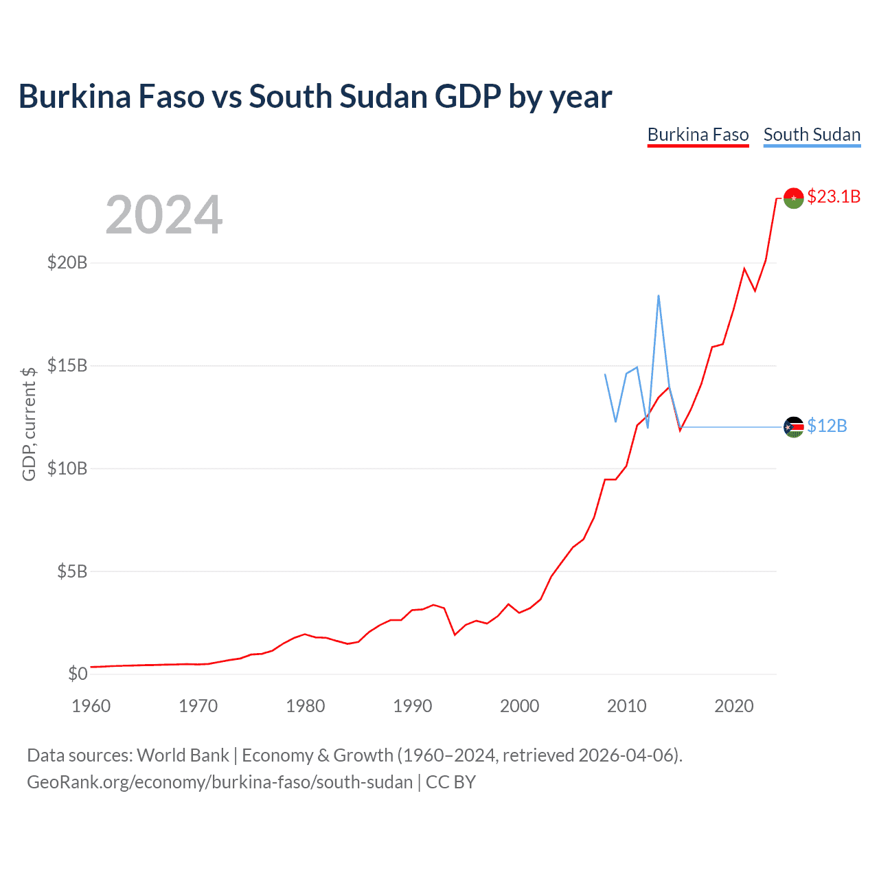 Burkina Faso has a GDP of $23.1B compared to $12B for South Sudan, ranking 122/197 and 149/197 by economy size, respectively.