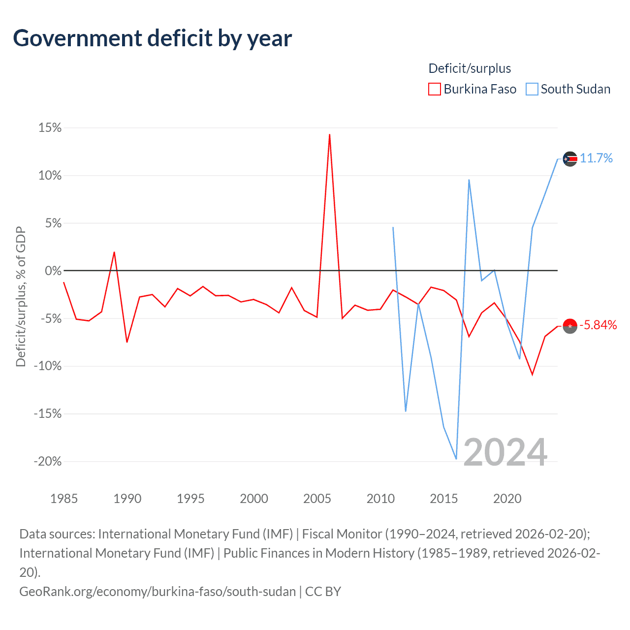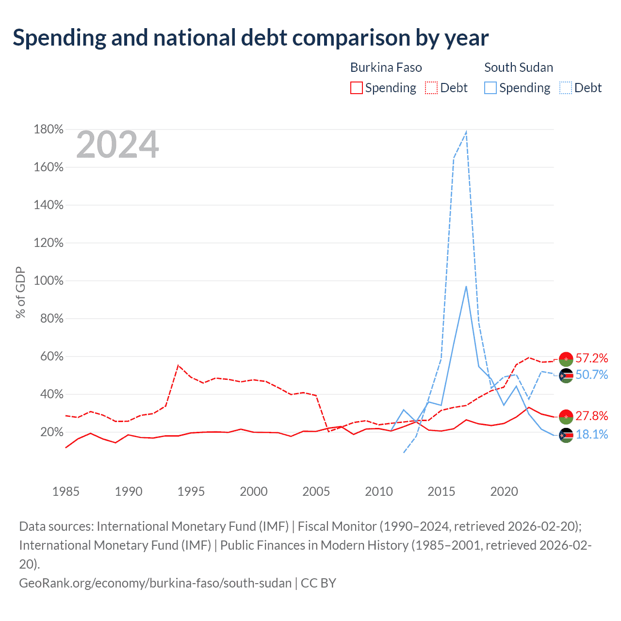 Burkina Faso has $13.2B in government debt (57.2% of GDP), compared to $7.04B (50.7% of GDP) in South Sudan.
