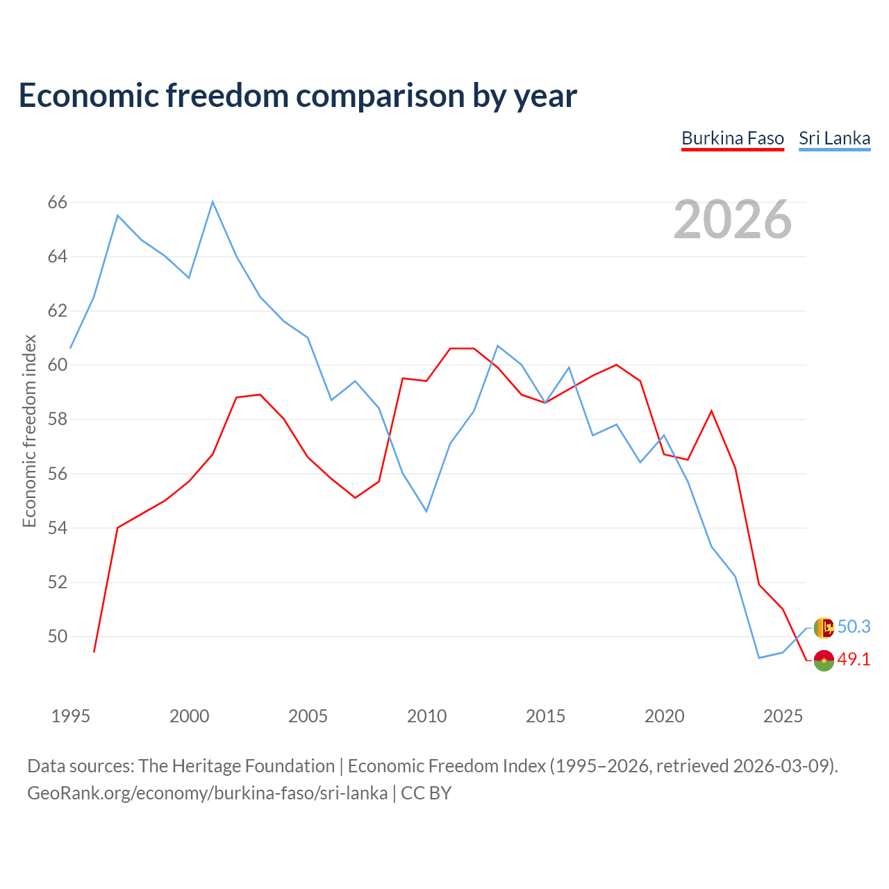 The Economic Freedom Index for Burkina Faso is 49.1, ranking 167/197, compared to 50.3 for Sri Lanka, ranking 162/197. The chart above displays a comparison of annual changes in economic freedom indexes.