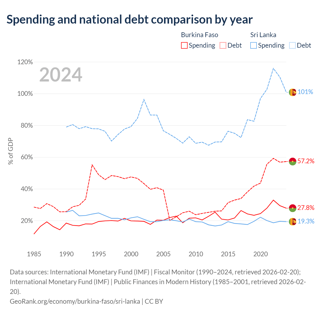 Burkina Faso has $13.2B in government debt (57.2% of GDP), compared to $99.8B (100.8% of GDP) in Sri Lanka.