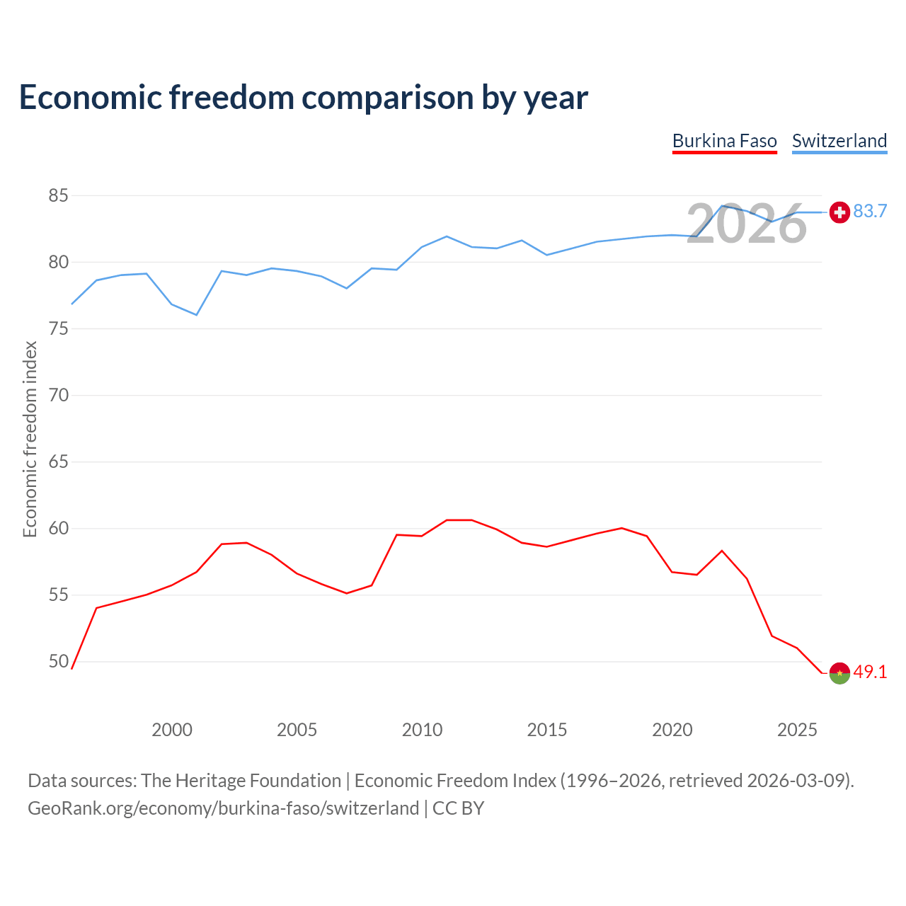 The Economic Freedom Index for Burkina Faso is 49.1, ranking 167/197, compared to 83.7 for Switzerland, ranking 2/197. The chart above displays a comparison of annual changes in economic freedom indexes.