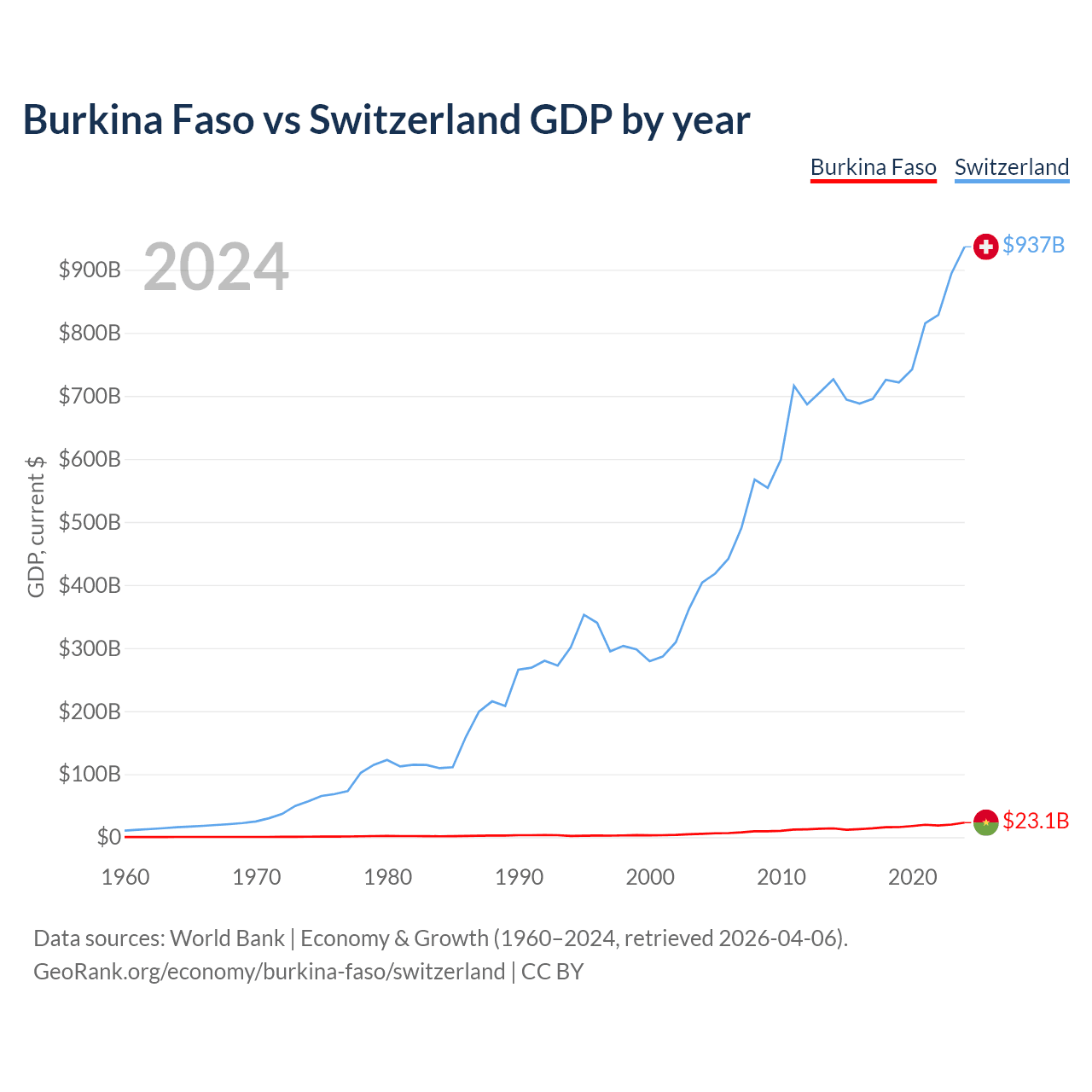 Burkina Faso has a GDP of $23.1B compared to $937B for Switzerland, ranking 122/197 and 20/197 by economy size, respectively.