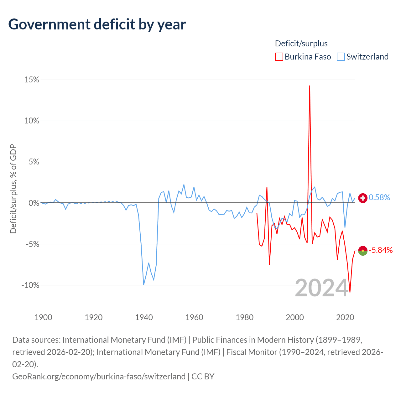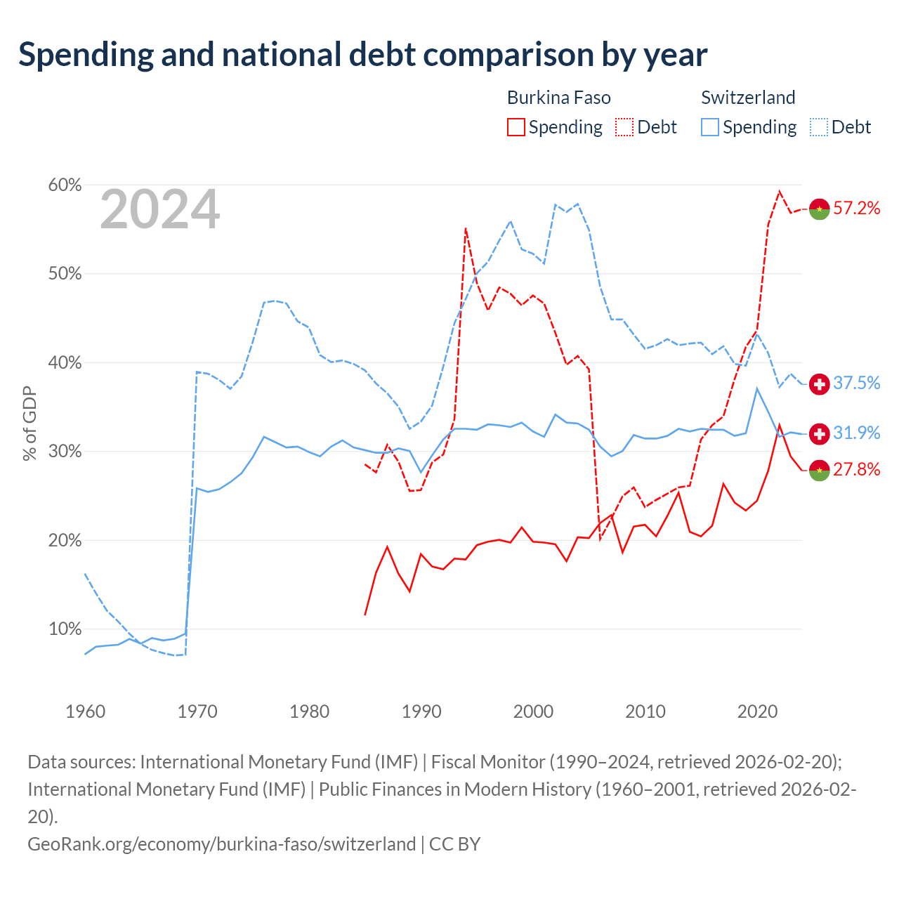 Burkina Faso has $13.2B in government debt (57.2% of GDP), compared to $351B (37.5% of GDP) in Switzerland.