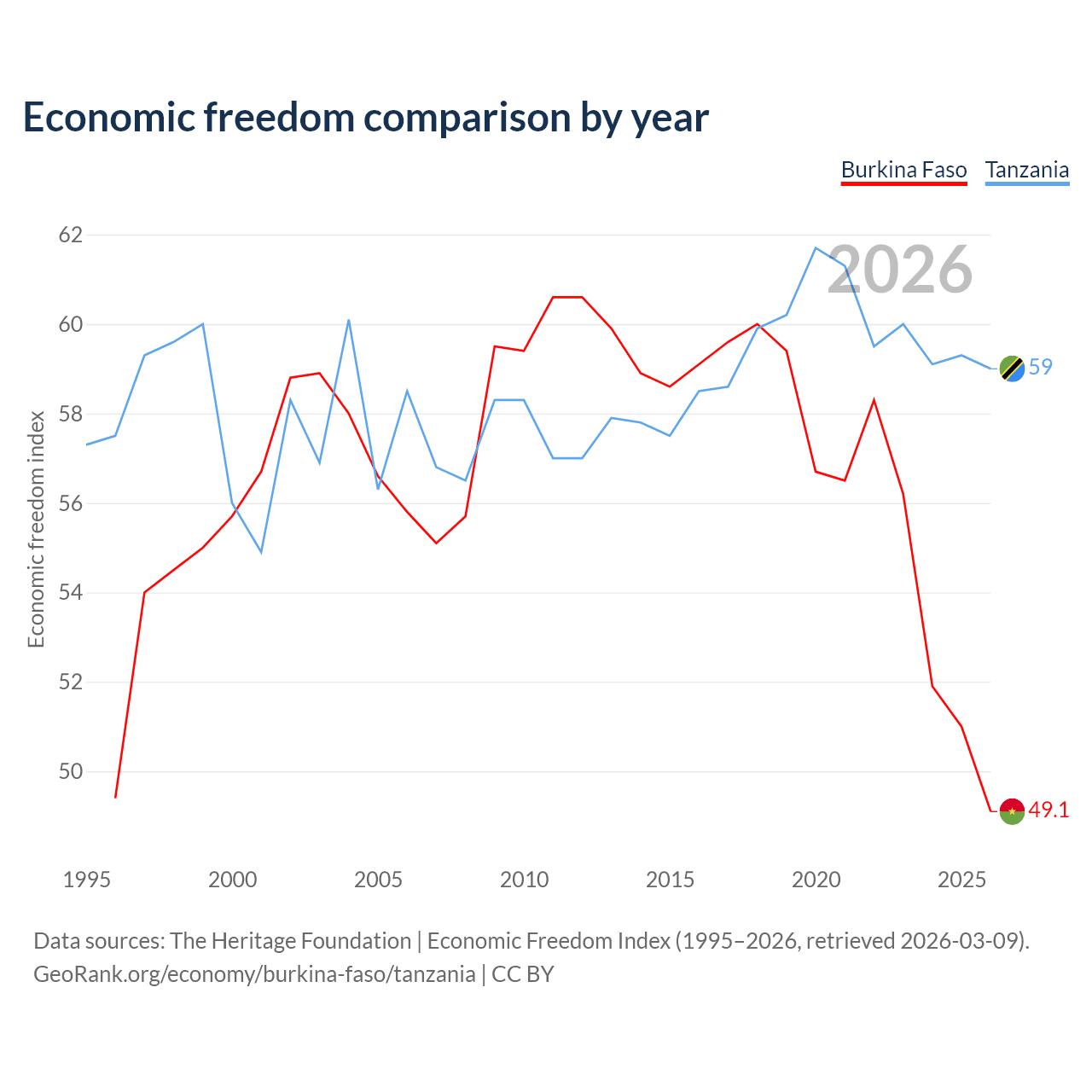 The Economic Freedom Index for Burkina Faso is 49.1, ranking 167/197, compared to 59 for Tanzania, ranking 106/197. The chart above displays a comparison of annual changes in economic freedom indexes.