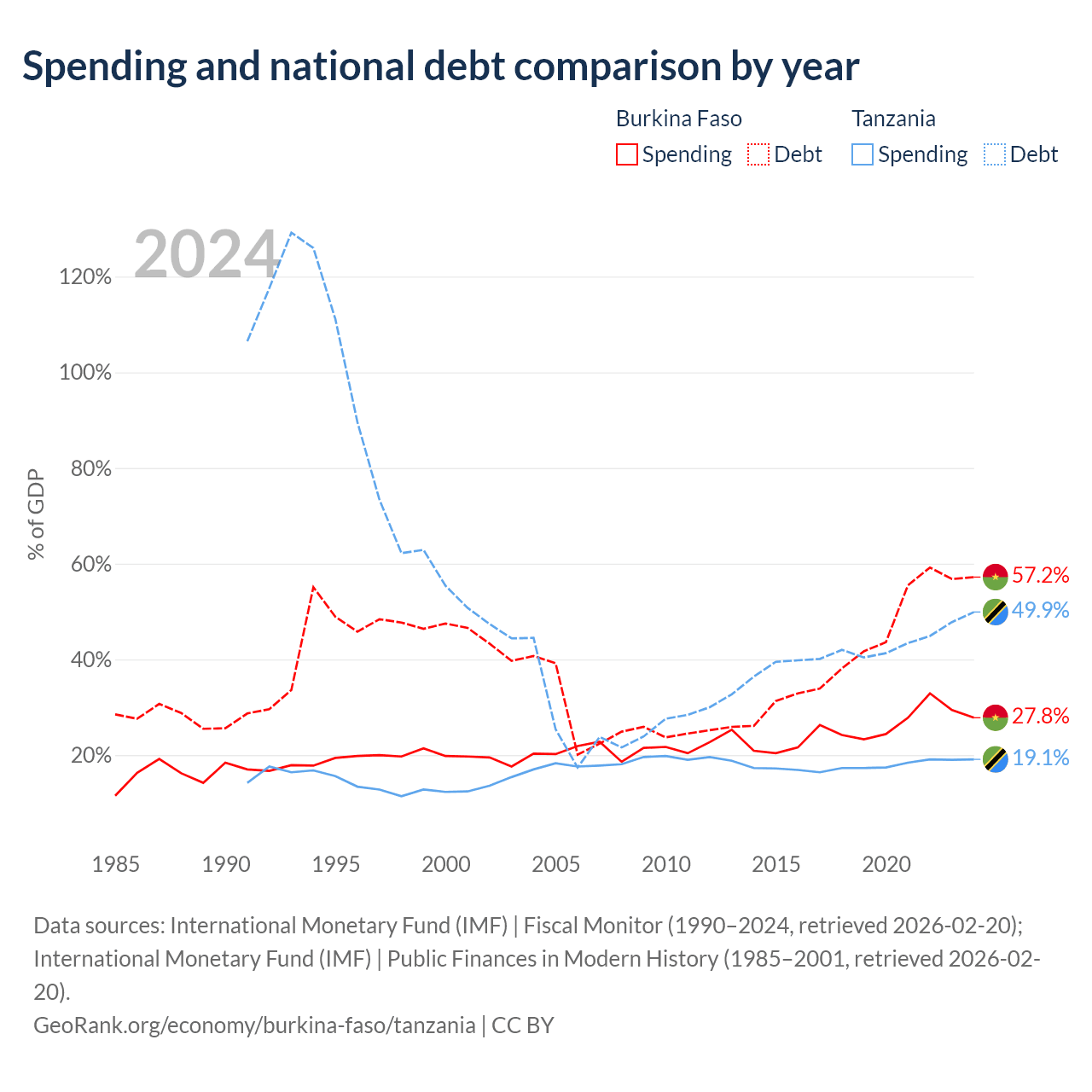Burkina Faso has $13.2B in government debt (57.2% of GDP), compared to $39.3B (49.9% of GDP) in Tanzania.