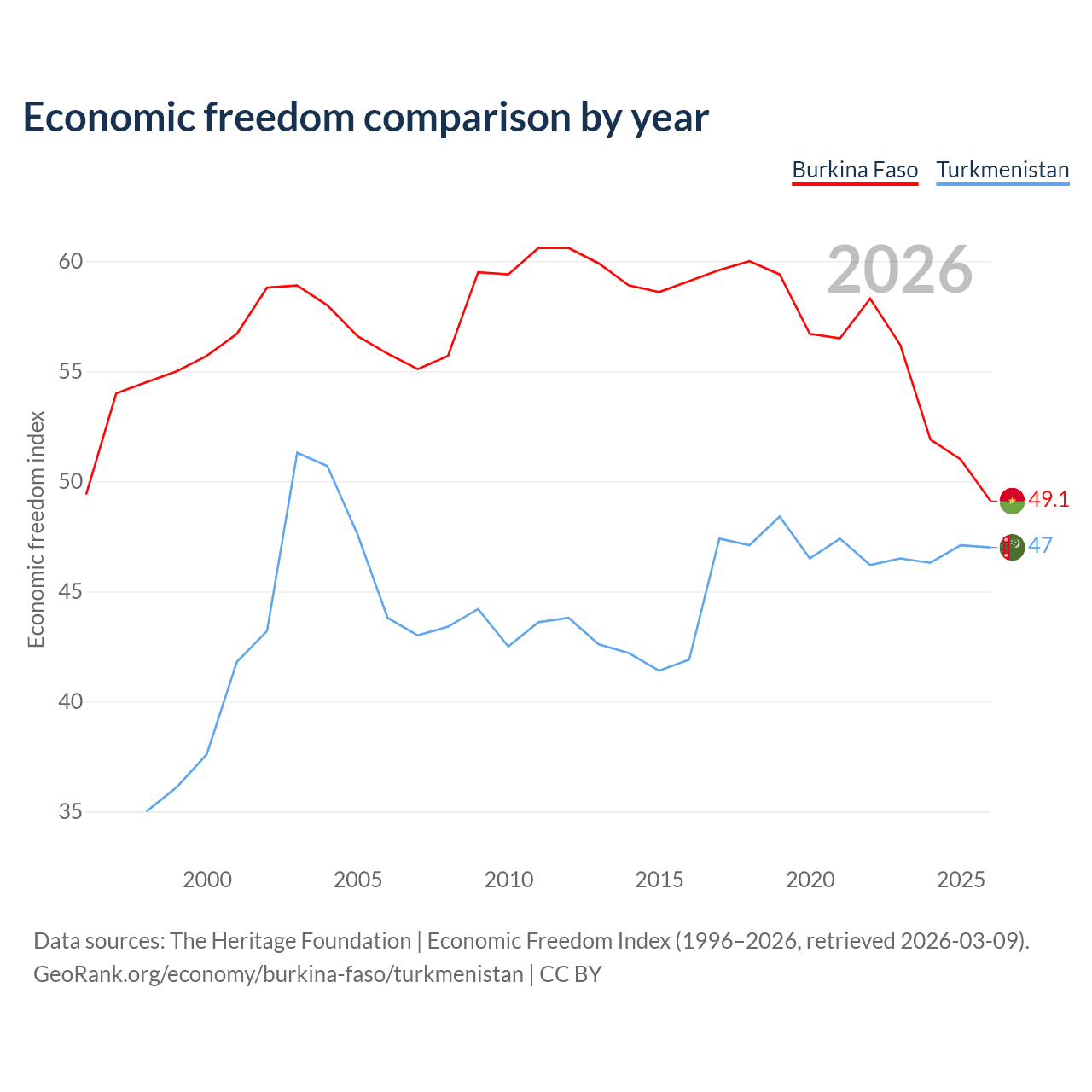 The Economic Freedom Index for Burkina Faso is 49.1, ranking 167/197, compared to 47 for Turkmenistan, ranking 177/197. The chart above displays a comparison of annual changes in economic freedom indexes.