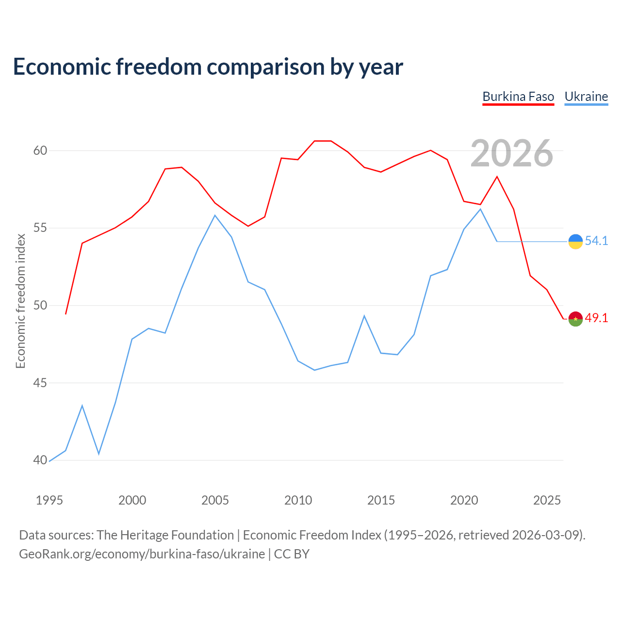 The Economic Freedom Index for Burkina Faso is 49.1, ranking 167/197, compared to 54.1 for Ukraine, ranking 135/197. The chart above displays a comparison of annual changes in economic freedom indexes.