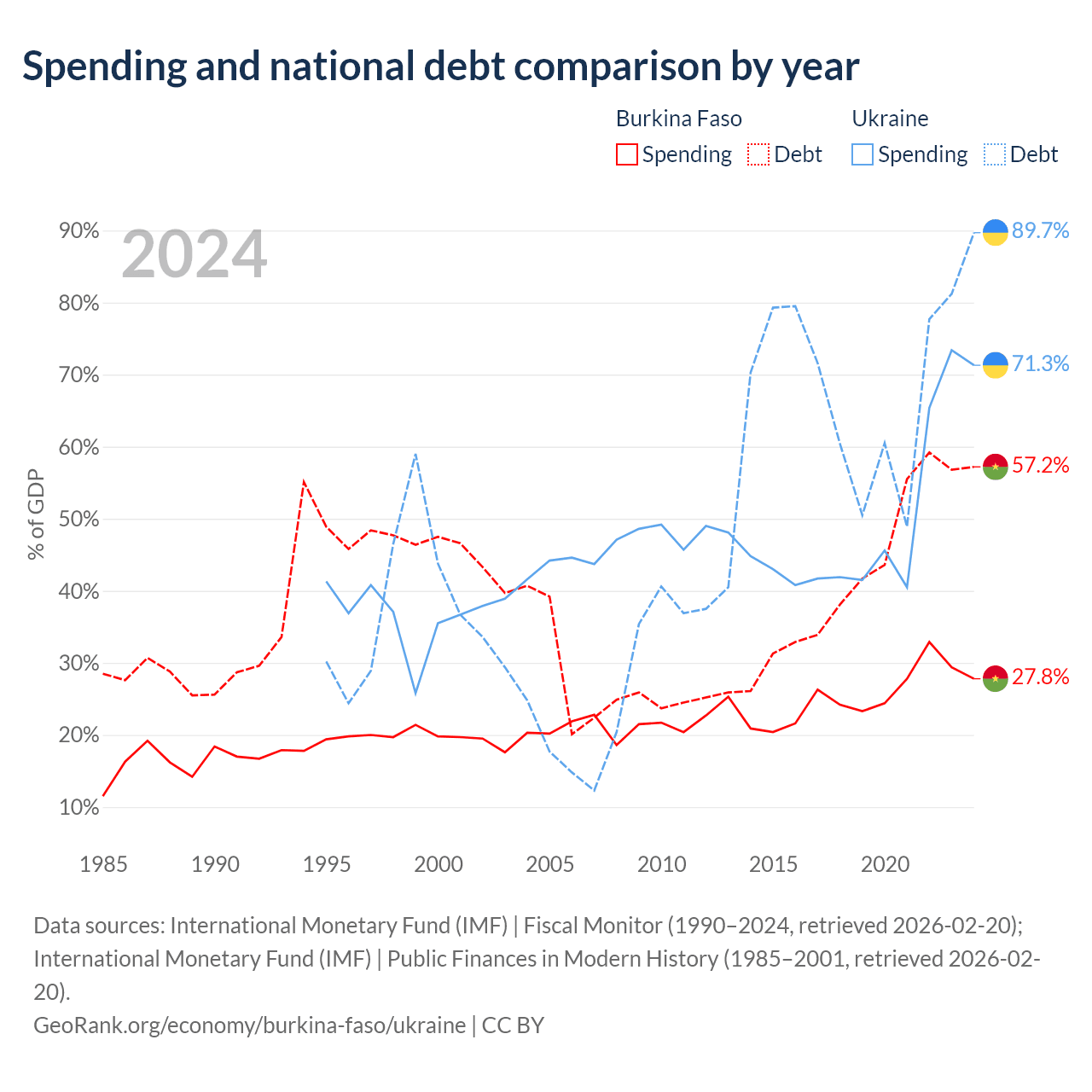 Burkina Faso has $13.2B in government debt (57.2% of GDP), compared to $171B (89.7% of GDP) in Ukraine.
