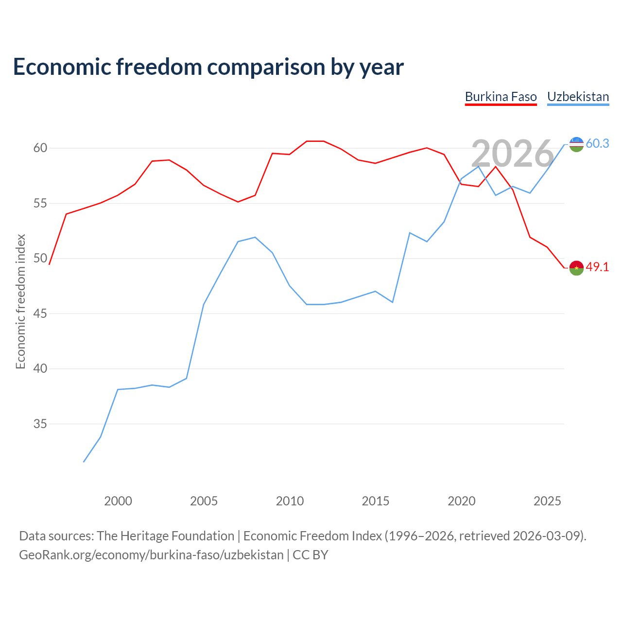 The Economic Freedom Index for Burkina Faso is 49.1, ranking 167/197, compared to 60.3 for Uzbekistan, ranking 94/197. The chart above displays a comparison of annual changes in economic freedom indexes.