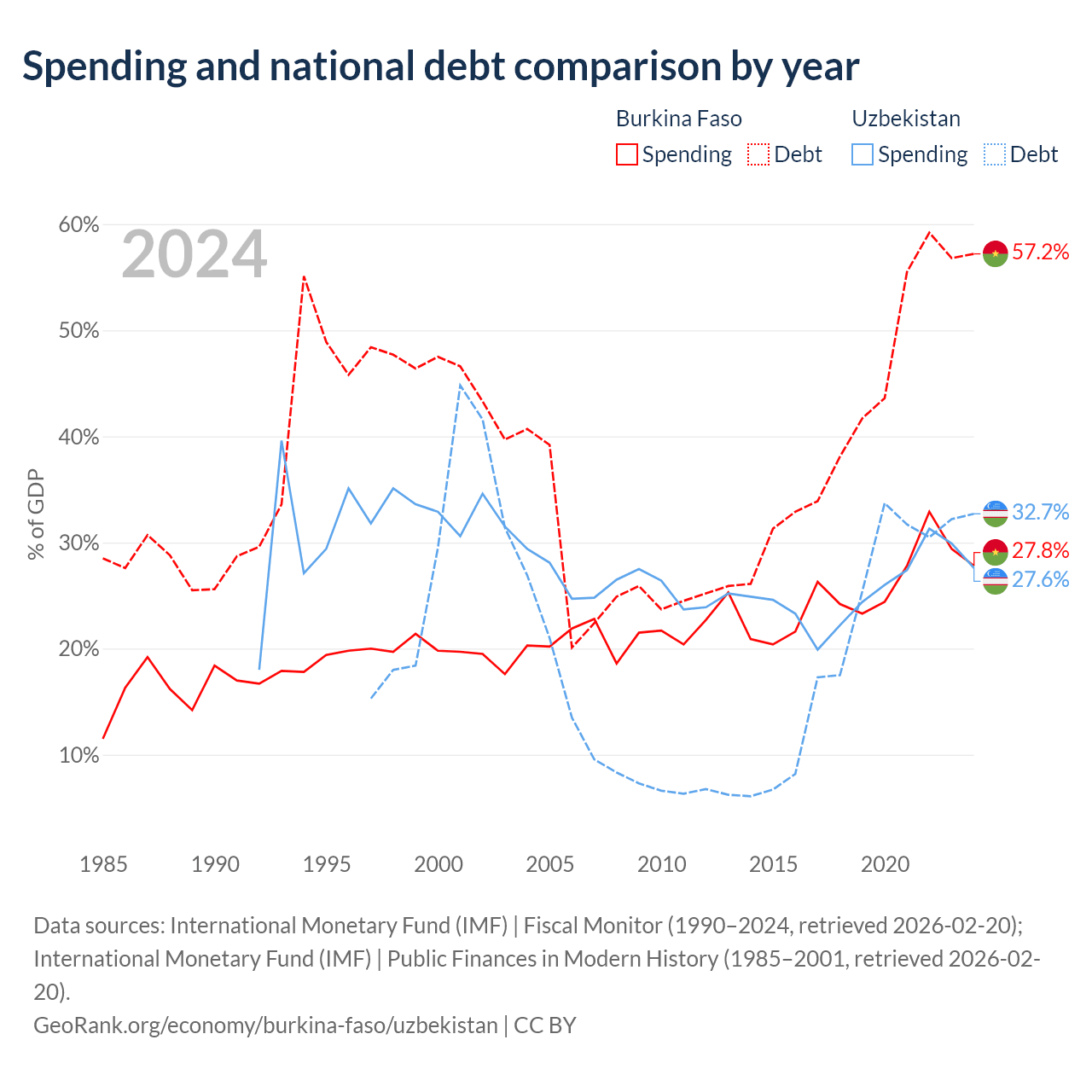 Burkina Faso has $13.2B in government debt (57.2% of GDP), compared to $37.5B (32.7% of GDP) in Uzbekistan.