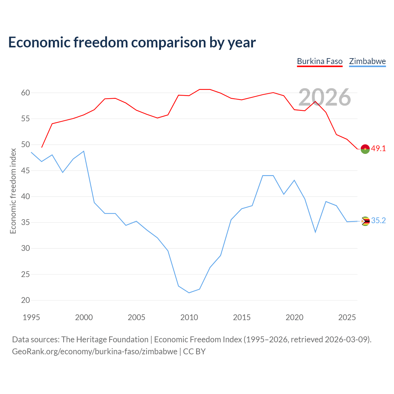 The Economic Freedom Index for Burkina Faso is 49.1, ranking 167/197, compared to 35.2 for Zimbabwe, ranking 190/197. The chart above displays a comparison of annual changes in economic freedom indexes.