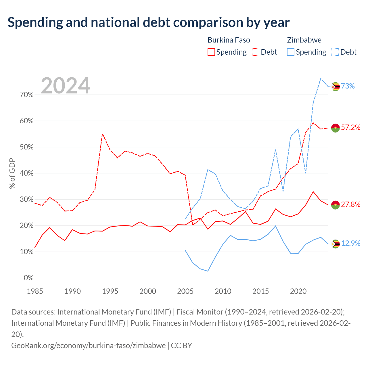 Burkina Faso has $13.2B in government debt (57.2% of GDP), compared to $30.3B (73% of GDP) in Zimbabwe.