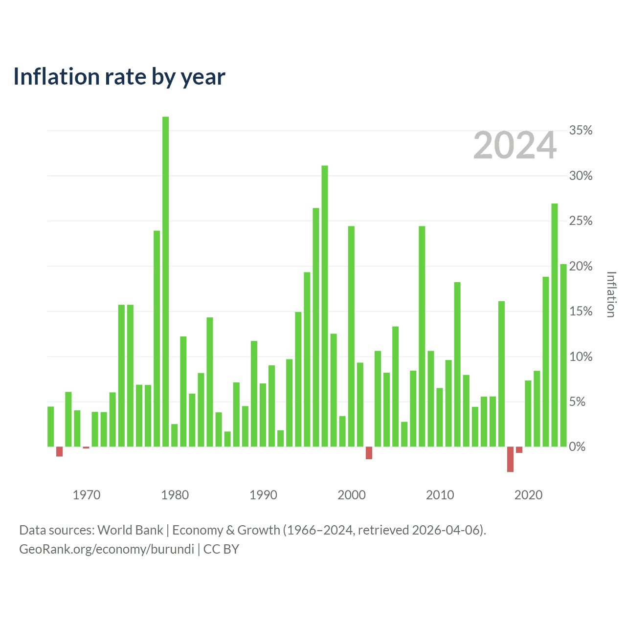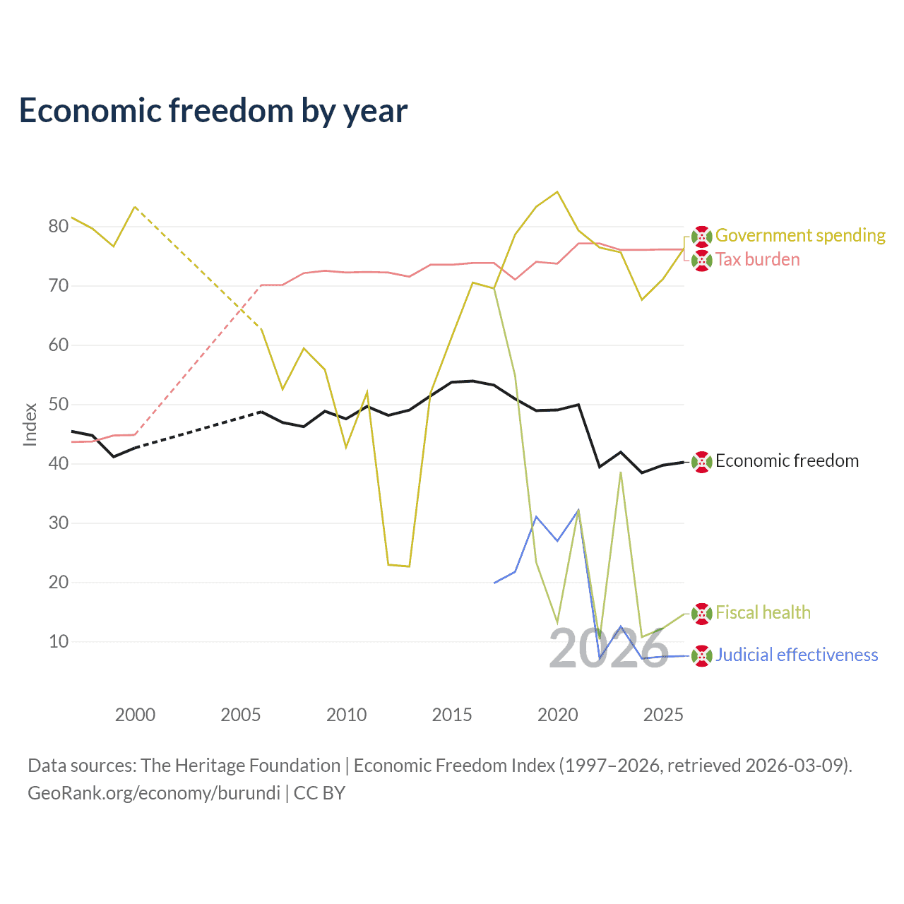 Burundi is ranked 168/174 for economic freedom with a score of 40.2, compared to 141/162 and a score of 48.7 in 2006.