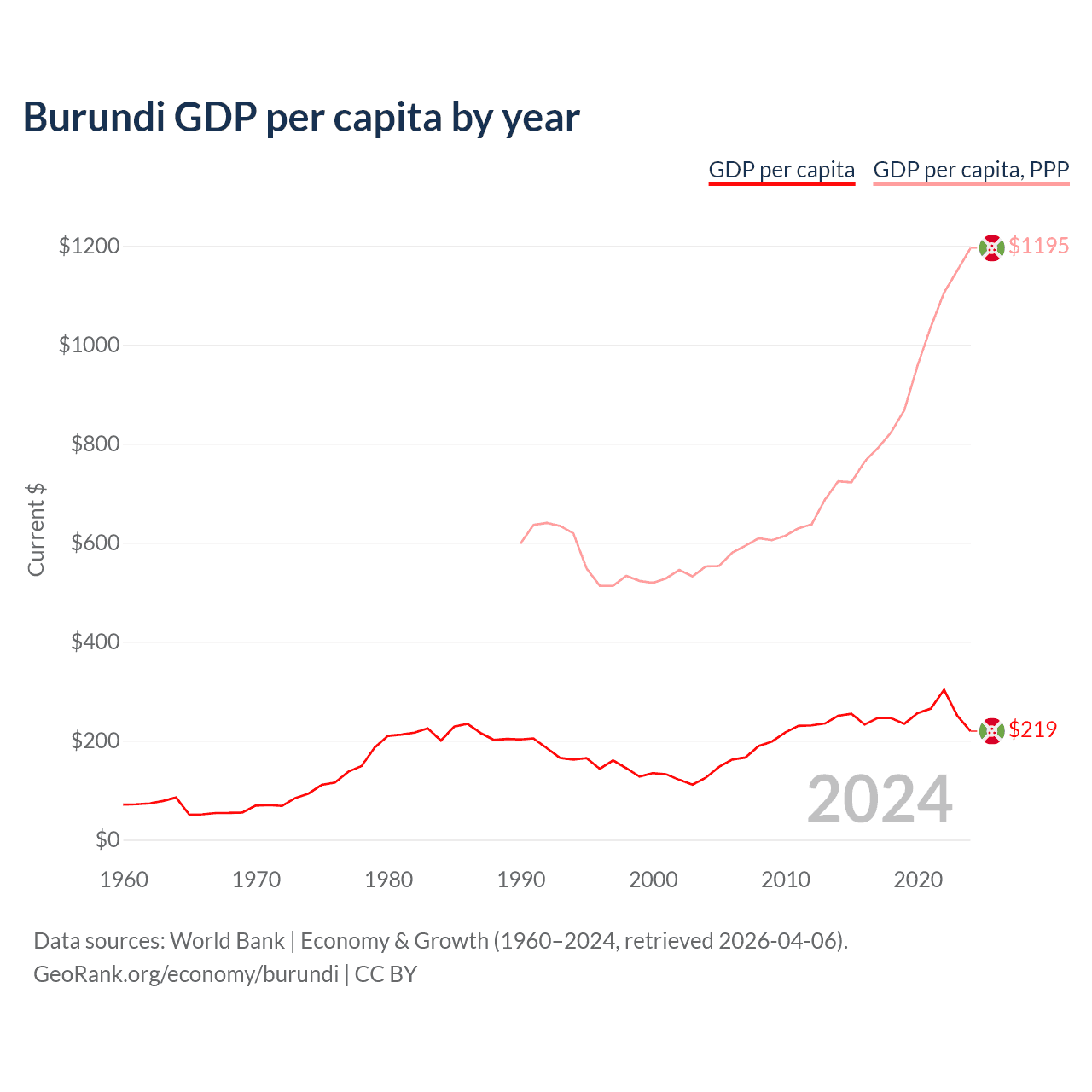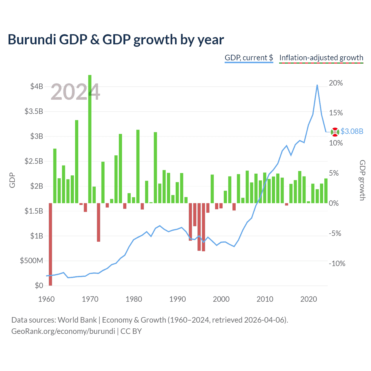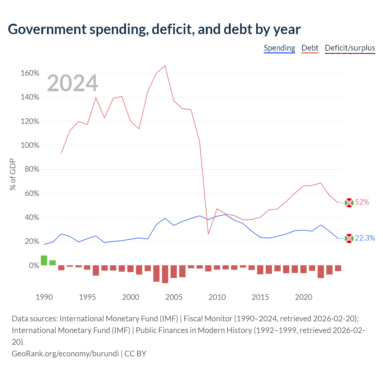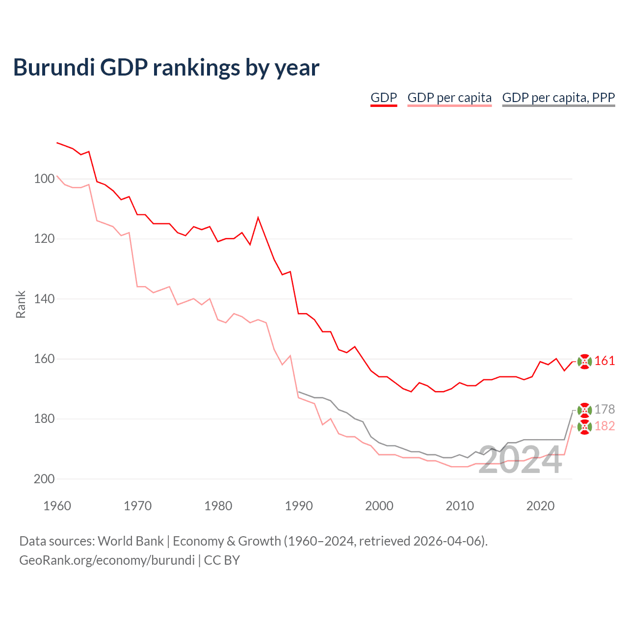 Burundi ranked 169/197 by economy size with a GDP of $3.08B and 197/197 by GDP per capita at $219.4. Burundi has $1.6B in government debt, with a debt-to-GDP ratio of 52%.