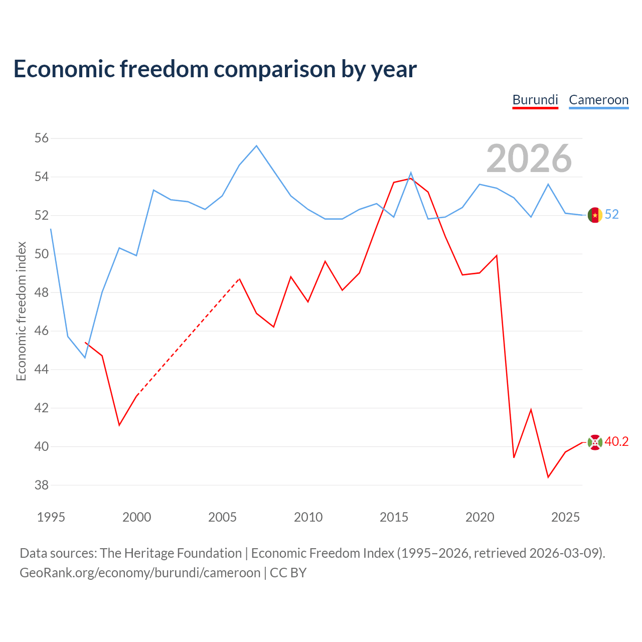 The Economic Freedom Index for Burundi is 40.2, ranking 187/197, compared to 52 for Cameroon, ranking 151/197. The chart above displays a comparison of annual changes in economic freedom indexes.