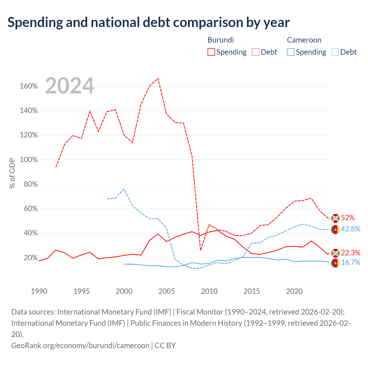 Burundi has $1.6B in government debt (52% of GDP), compared to $22.8B (42.8% of GDP) in Cameroon.