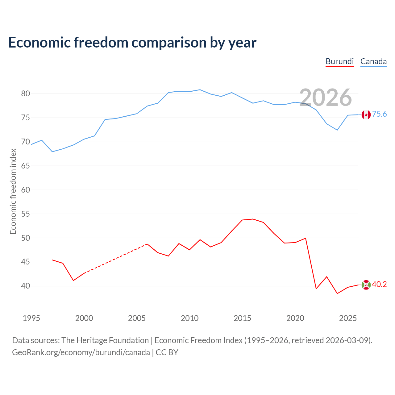 The Economic Freedom Index for Burundi is 40.2, ranking 187/197, compared to 75.6 for Canada, ranking 17/197. The chart above displays a comparison of annual changes in economic freedom indexes.