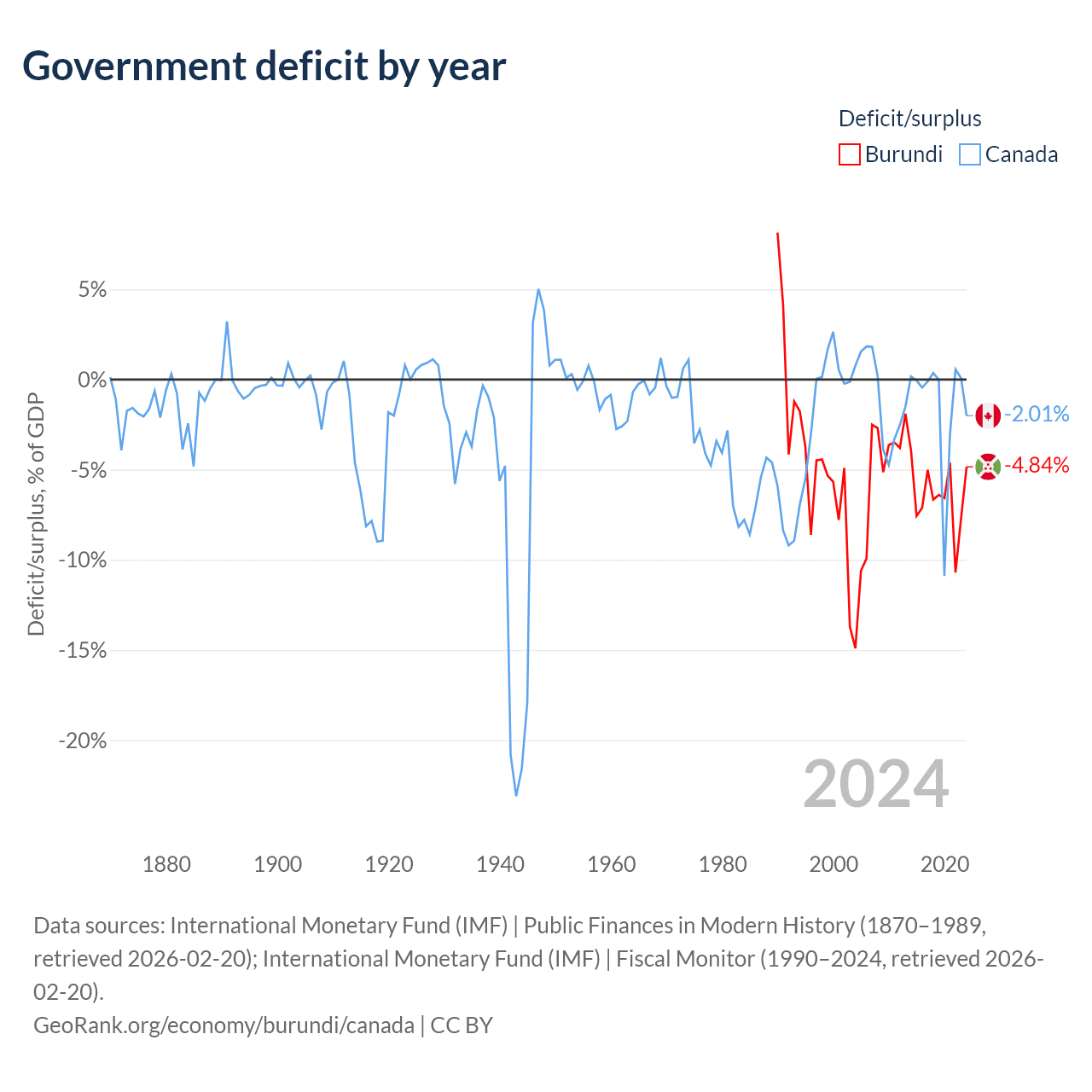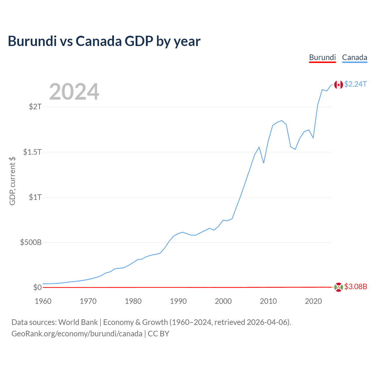 Burundi has a GDP of $3.08B compared to $2.24T for Canada, ranking 169/197 and 9/197 by economy size, respectively.