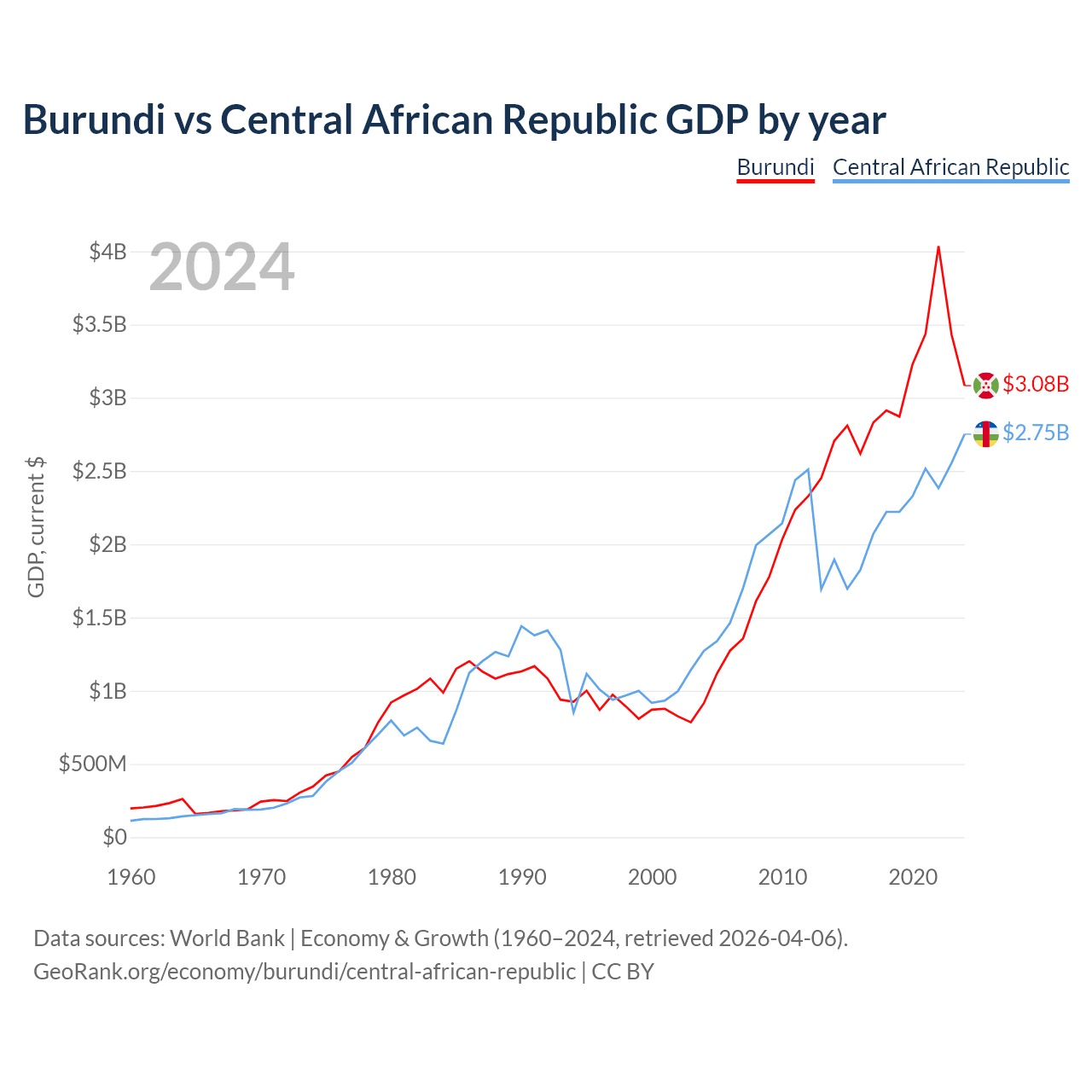 Burundi vs Central African Republic GDP by year