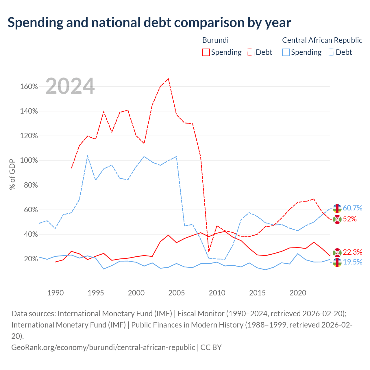 Burundi has $1.6B in government debt (52% of GDP), compared to $1.67B (60.7% of GDP) in the Central African Republic.