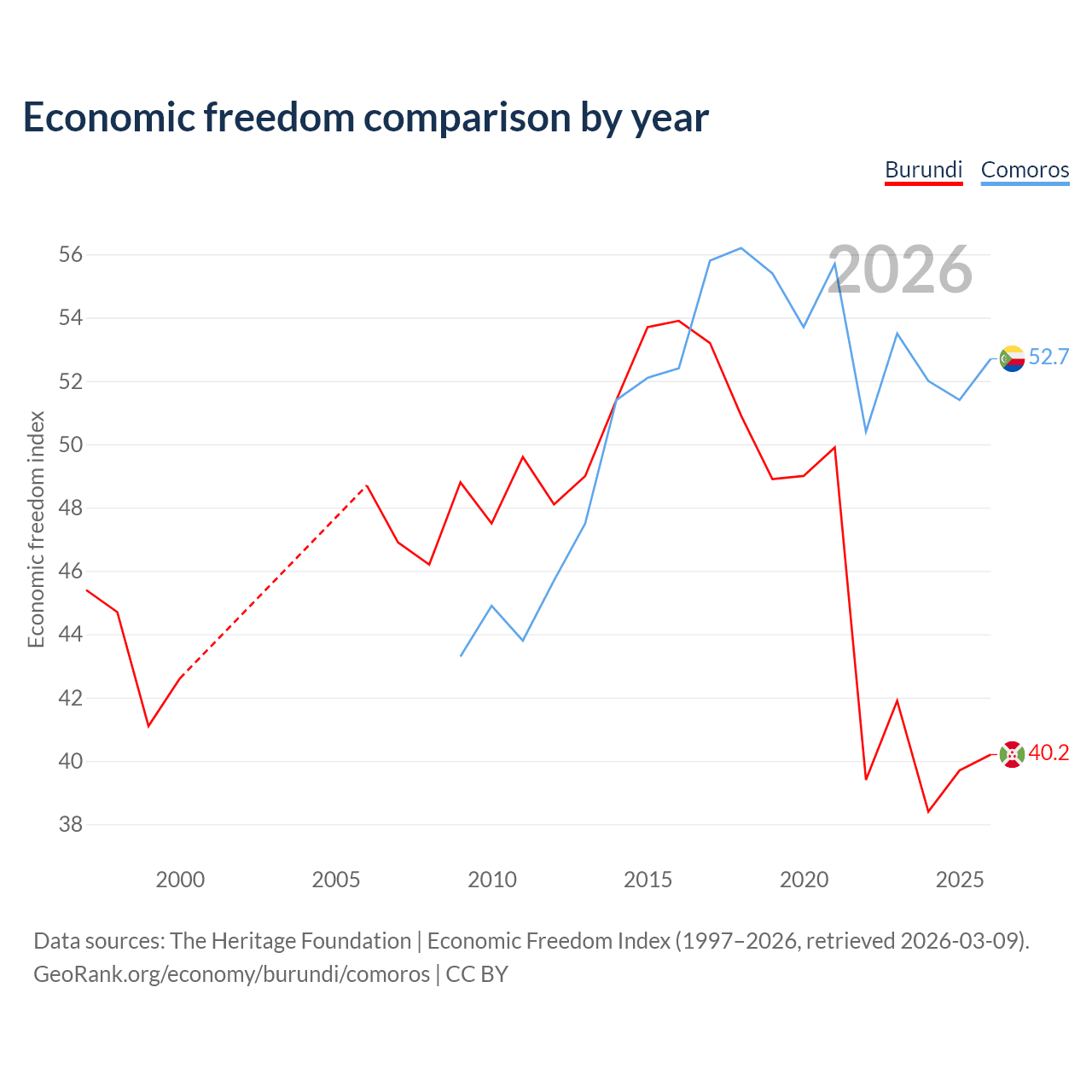 The Economic Freedom Index for Burundi is 40.2, ranking 187/197, compared to 52.7 for Comoros, ranking 145/197. The chart above displays a comparison of annual changes in economic freedom indexes.