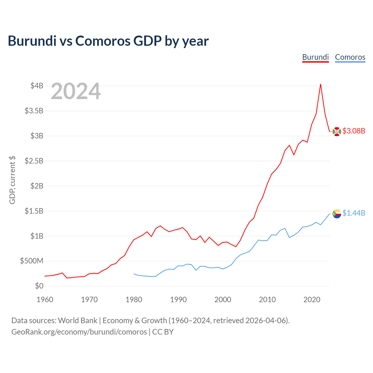 Burundi has a GDP of $3.08B compared to $1.44B for Comoros, ranking 169/197 and 183/197 by economy size, respectively.