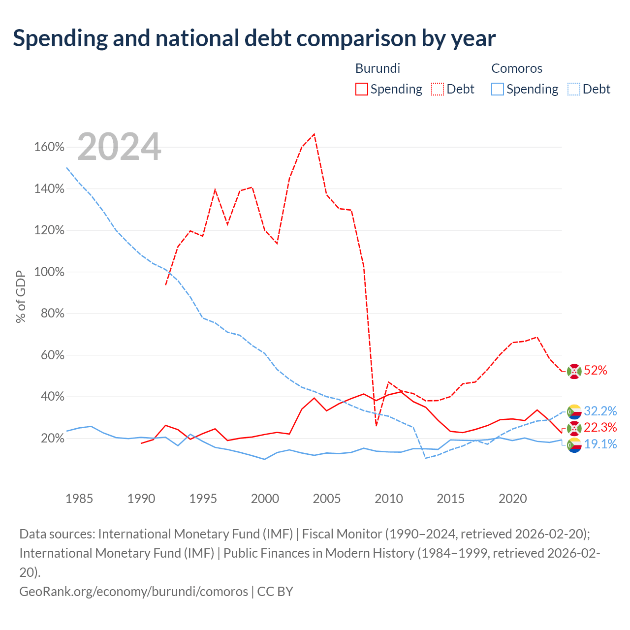 Burundi has $1.6B in government debt (52% of GDP), compared to $463M (32.2% of GDP) in Comoros.