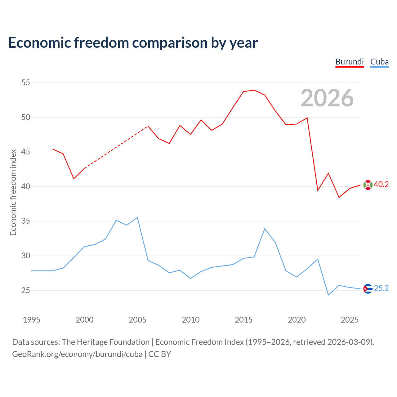 The Economic Freedom Index for Burundi is 40.2, ranking 187/197, compared to 25.2 for Cuba, ranking 195/197. The chart above displays a comparison of annual changes in economic freedom indexes.
