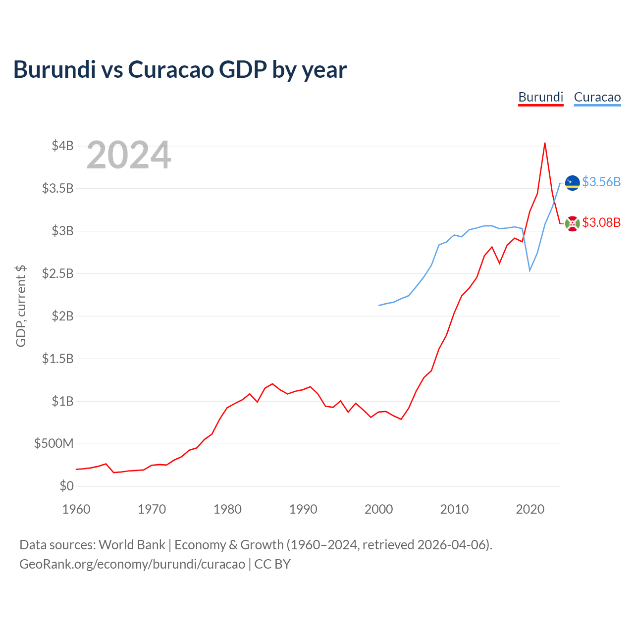 Burundi has a GDP of $3.08B compared to $3.56B for Curacao, ranking 169/197 and 167/197 by economy size, respectively.
