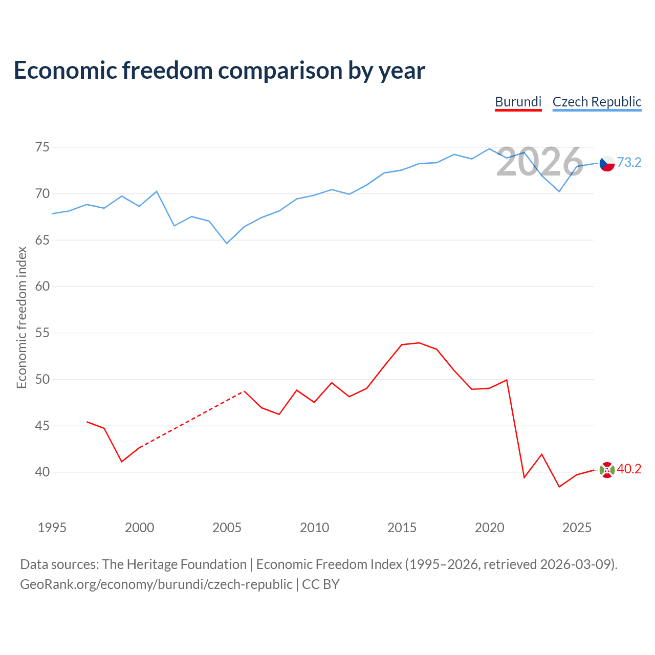 The Economic Freedom Index for Burundi is 40.2, ranking 187/197, compared to 73.2 for the Czech Republic, ranking 25/197. The chart above displays a comparison of annual changes in economic freedom indexes.