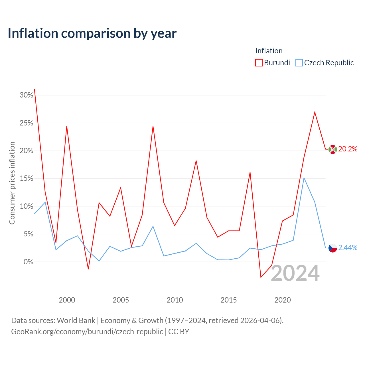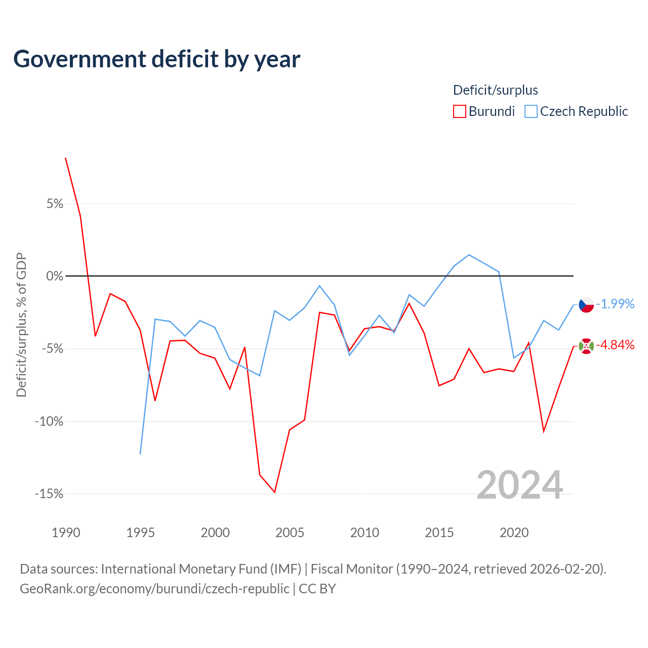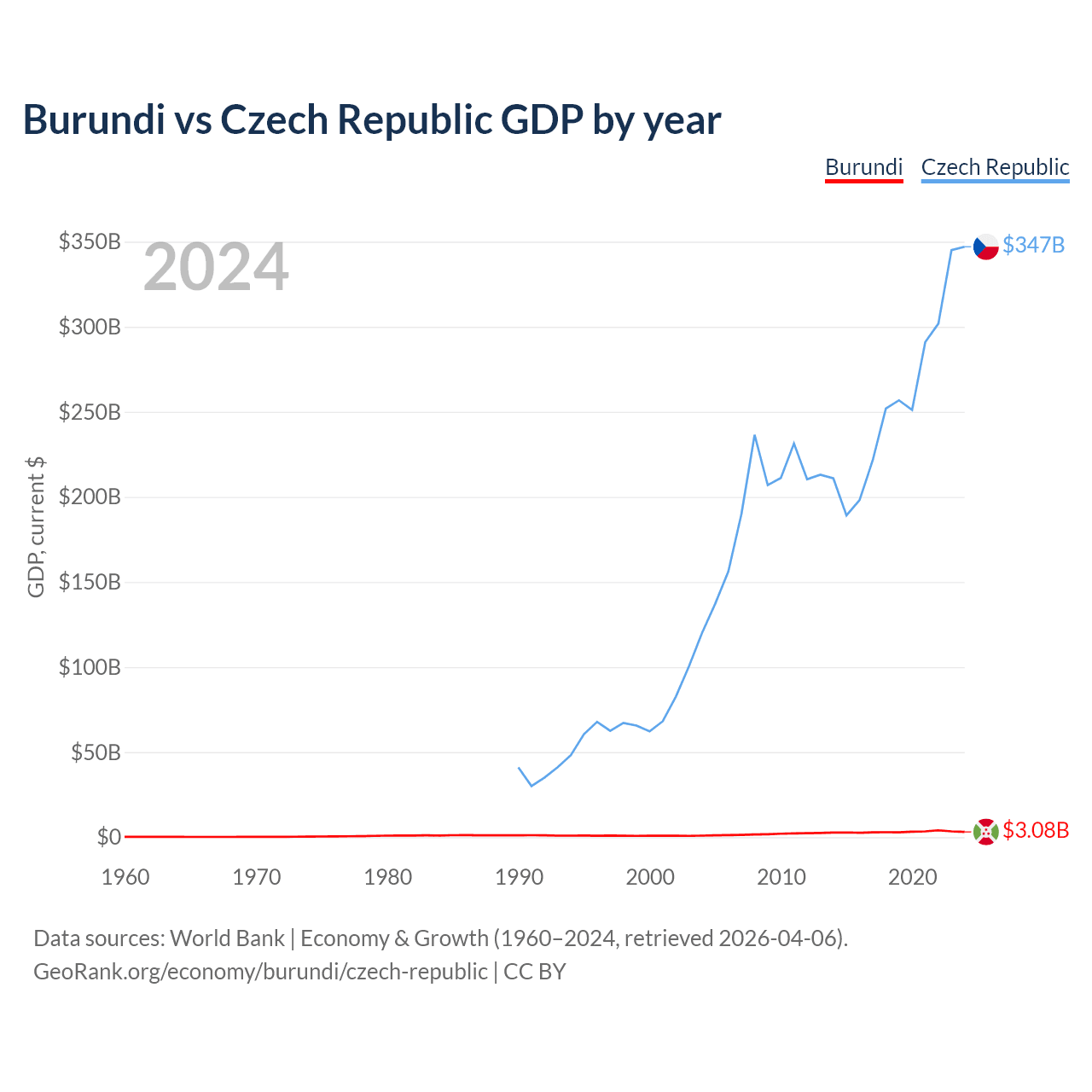 Burundi has a GDP of $3.08B compared to $347B for the Czech Republic, ranking 169/197 and 44/197 by economy size, respectively.