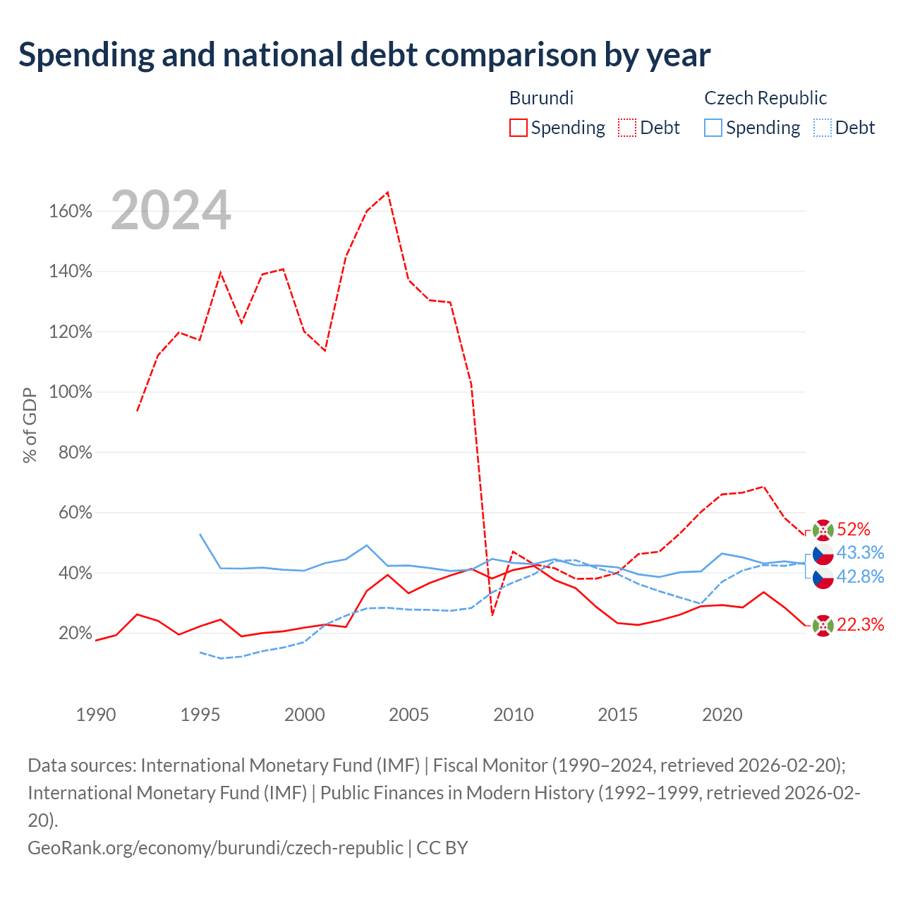 Burundi has $1.6B in government debt (52% of GDP), compared to $150B (43.3% of GDP) in the Czech Republic.