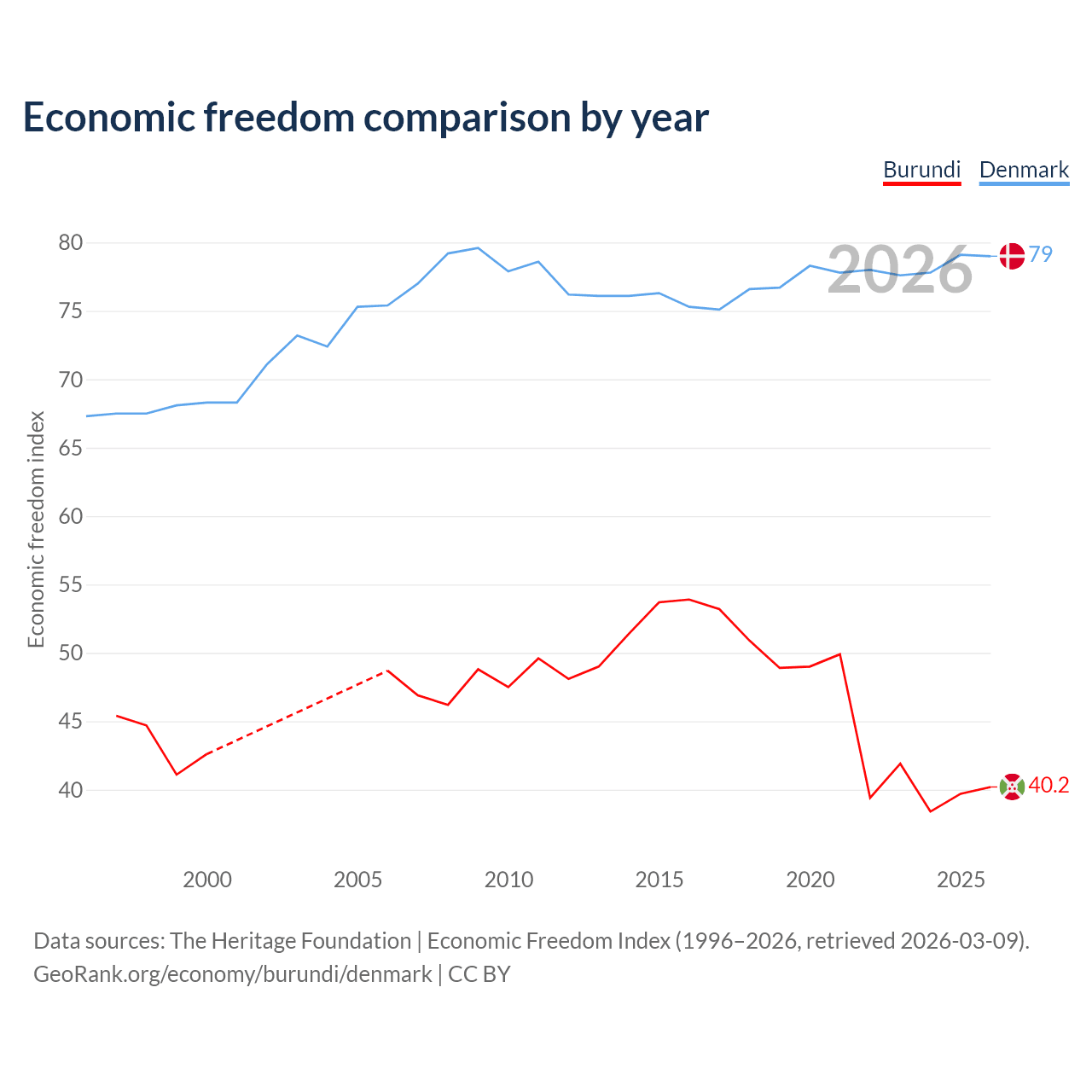 The Economic Freedom Index for Burundi is 40.2, ranking 187/197, compared to 79 for Denmark, ranking 8/197. The chart above displays a comparison of annual changes in economic freedom indexes.