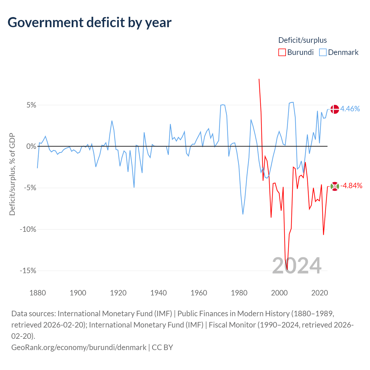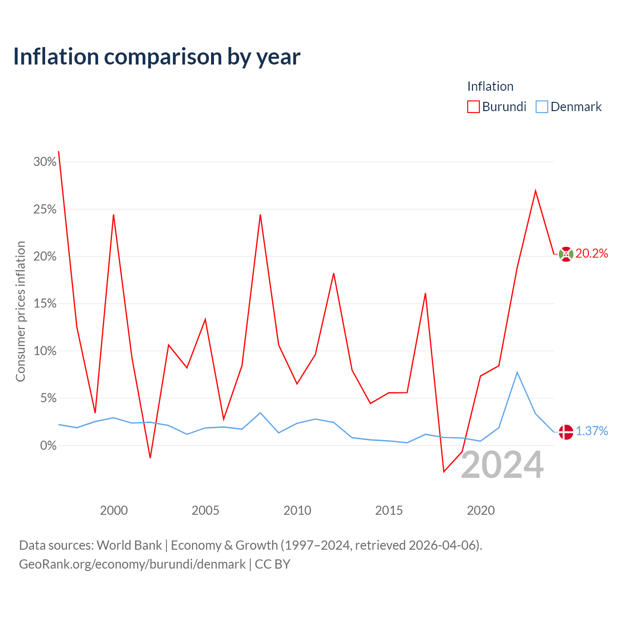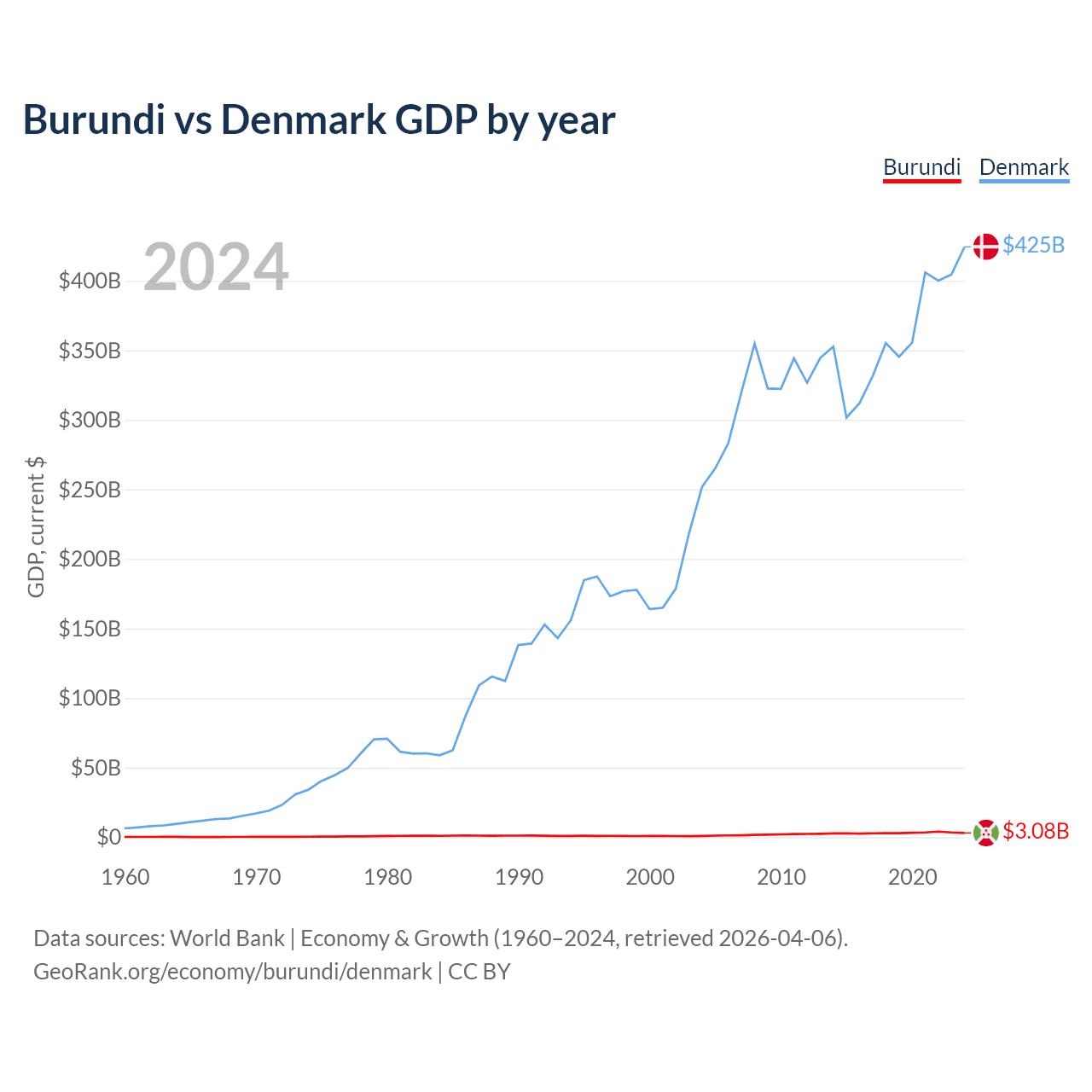 Burundi has a GDP of $3.08B compared to $425B for Denmark, ranking 169/197 and 37/197 by economy size, respectively.