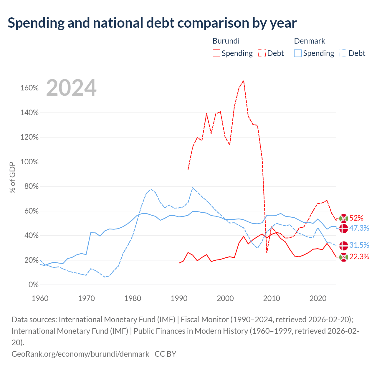 Burundi has $1.6B in government debt (52% of GDP), compared to $134B (31.5% of GDP) in Denmark.