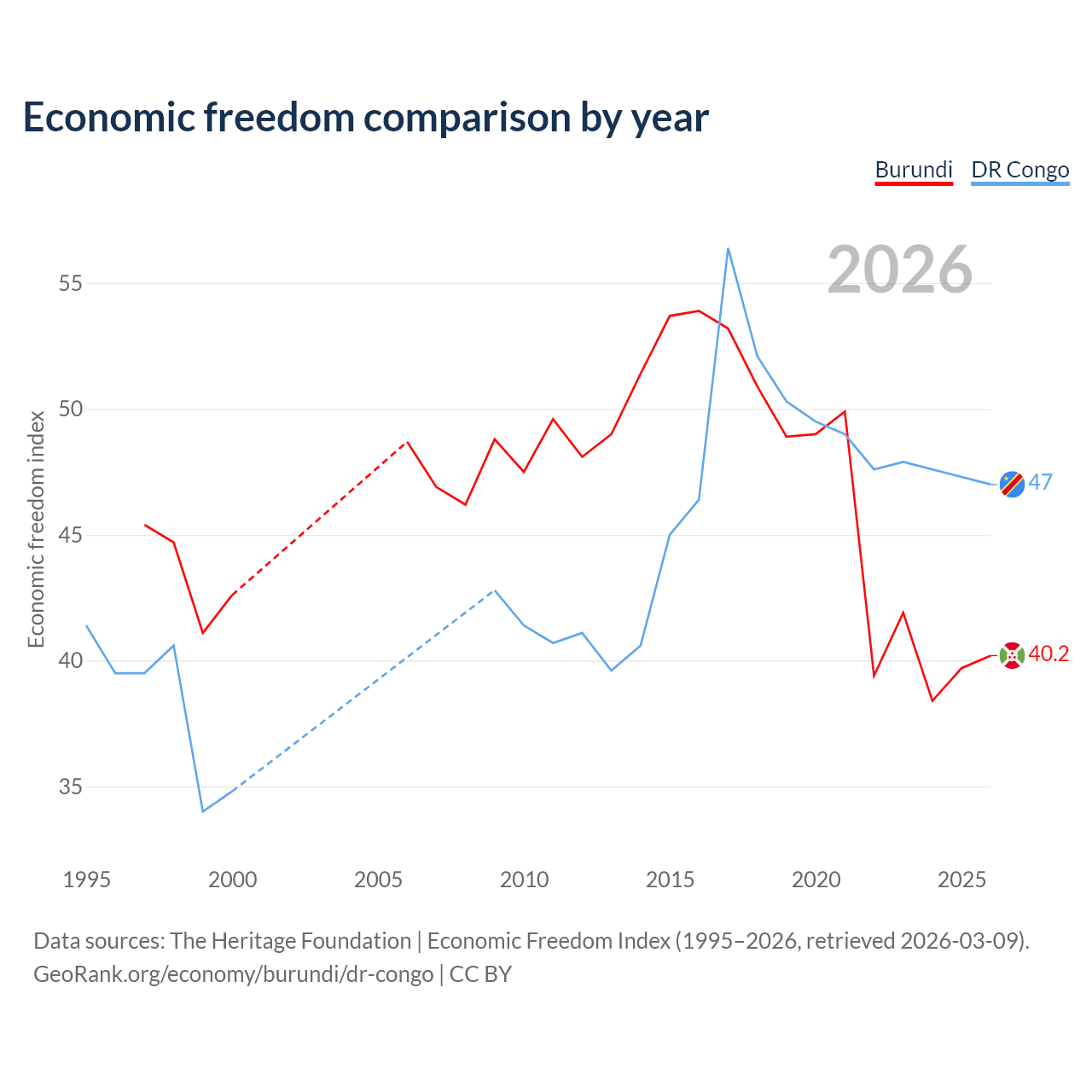 The Economic Freedom Index for Burundi is 40.2, ranking 187/197, compared to 47 for the DR Congo, ranking 176/197. The chart above displays a comparison of annual changes in economic freedom indexes.