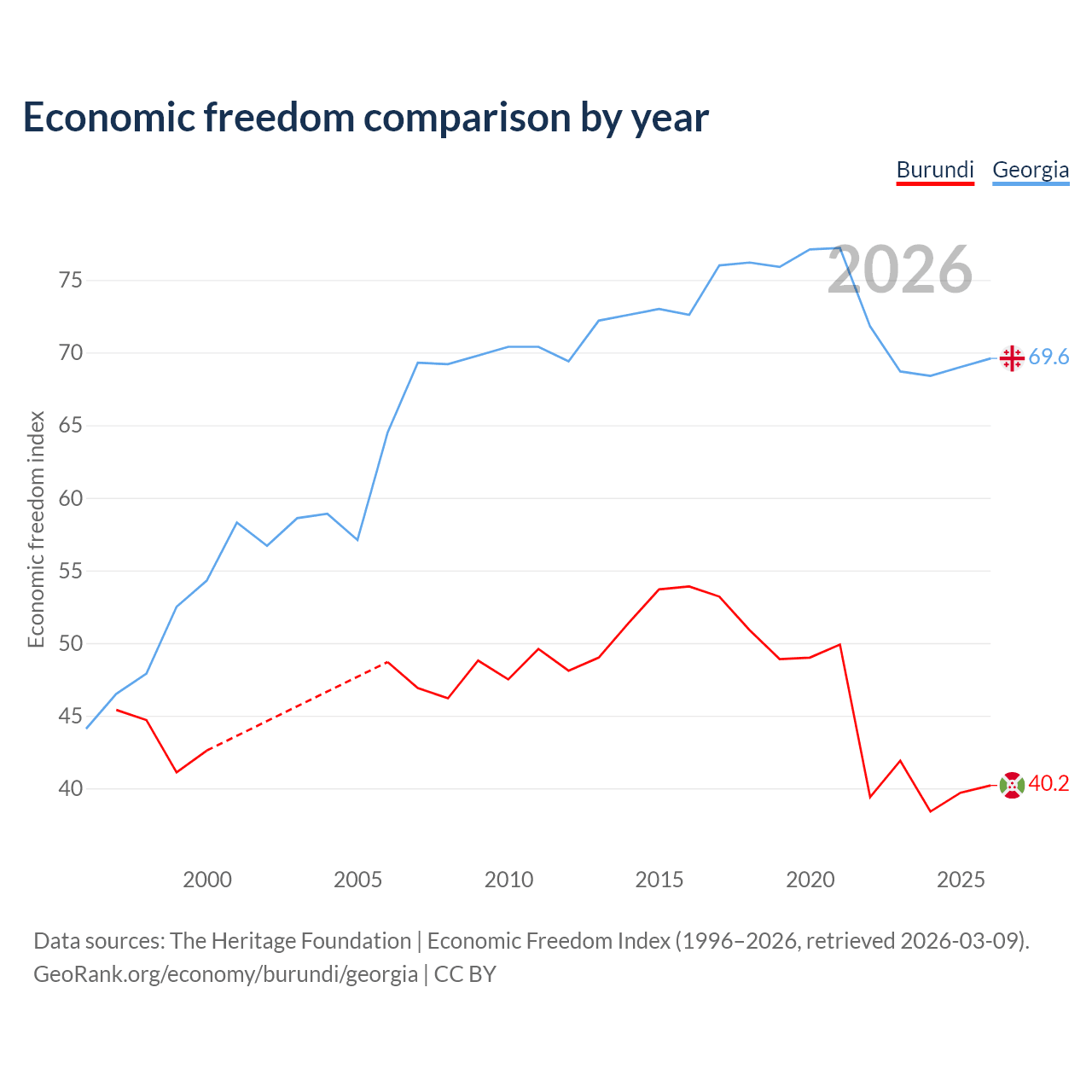 The Economic Freedom Index for Burundi is 40.2, ranking 187/197, compared to 69.6 for Georgia, ranking 41/197. The chart above displays a comparison of annual changes in economic freedom indexes.