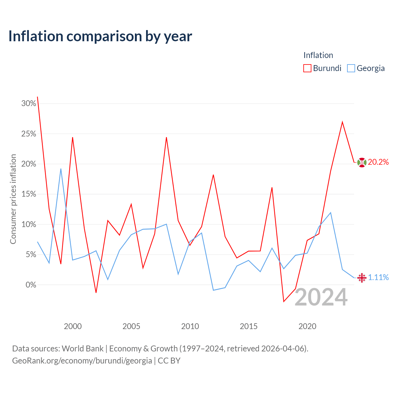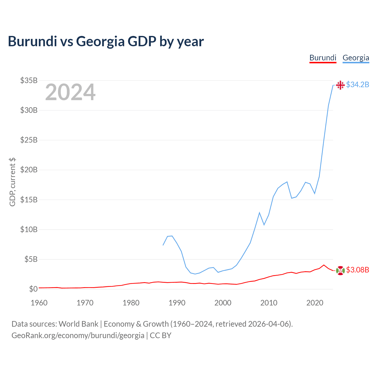 Burundi has a GDP of $3.08B compared to $34.2B for Georgia, ranking 169/197 and 107/197 by economy size, respectively.