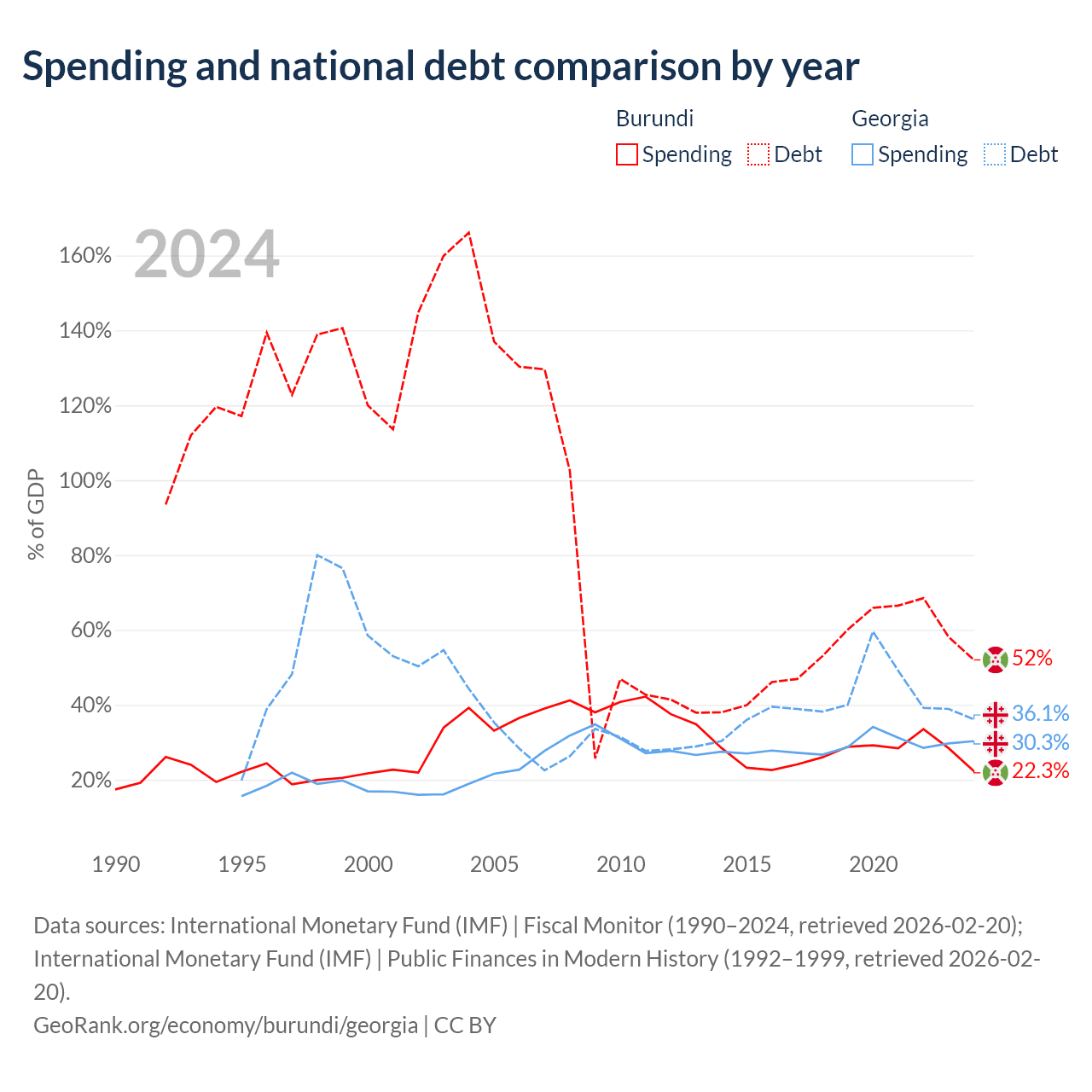 Burundi has $1.6B in government debt (52% of GDP), compared to $12.3B (36.1% of GDP) in Georgia.