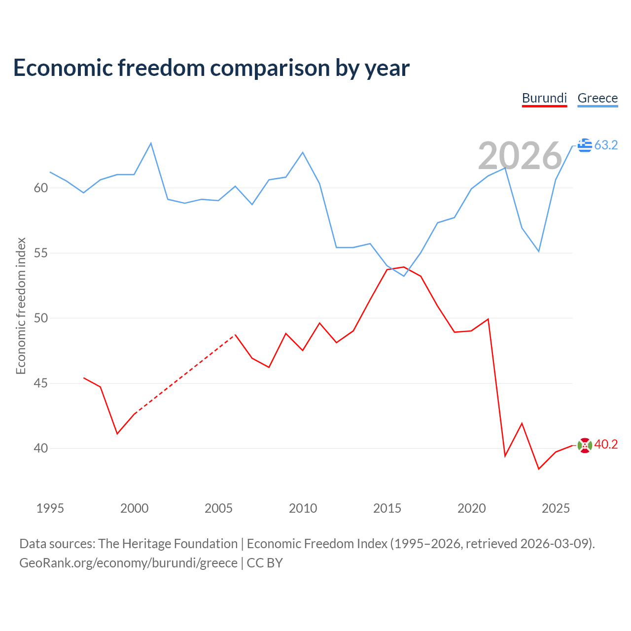 The Economic Freedom Index for Burundi is 40.2, ranking 187/197, compared to 63.2 for Greece, ranking 82/197. The chart above displays a comparison of annual changes in economic freedom indexes.