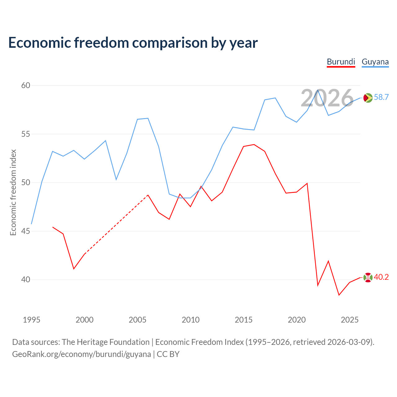 The Economic Freedom Index for Burundi is 40.2, ranking 187/197, compared to 58.7 for Guyana, ranking 109/197. The chart above displays a comparison of annual changes in economic freedom indexes.