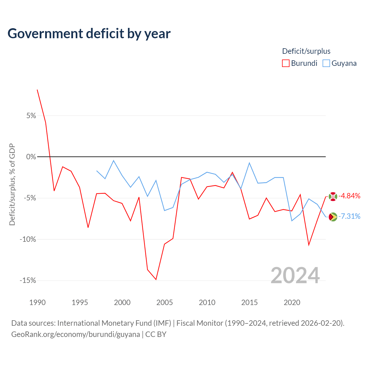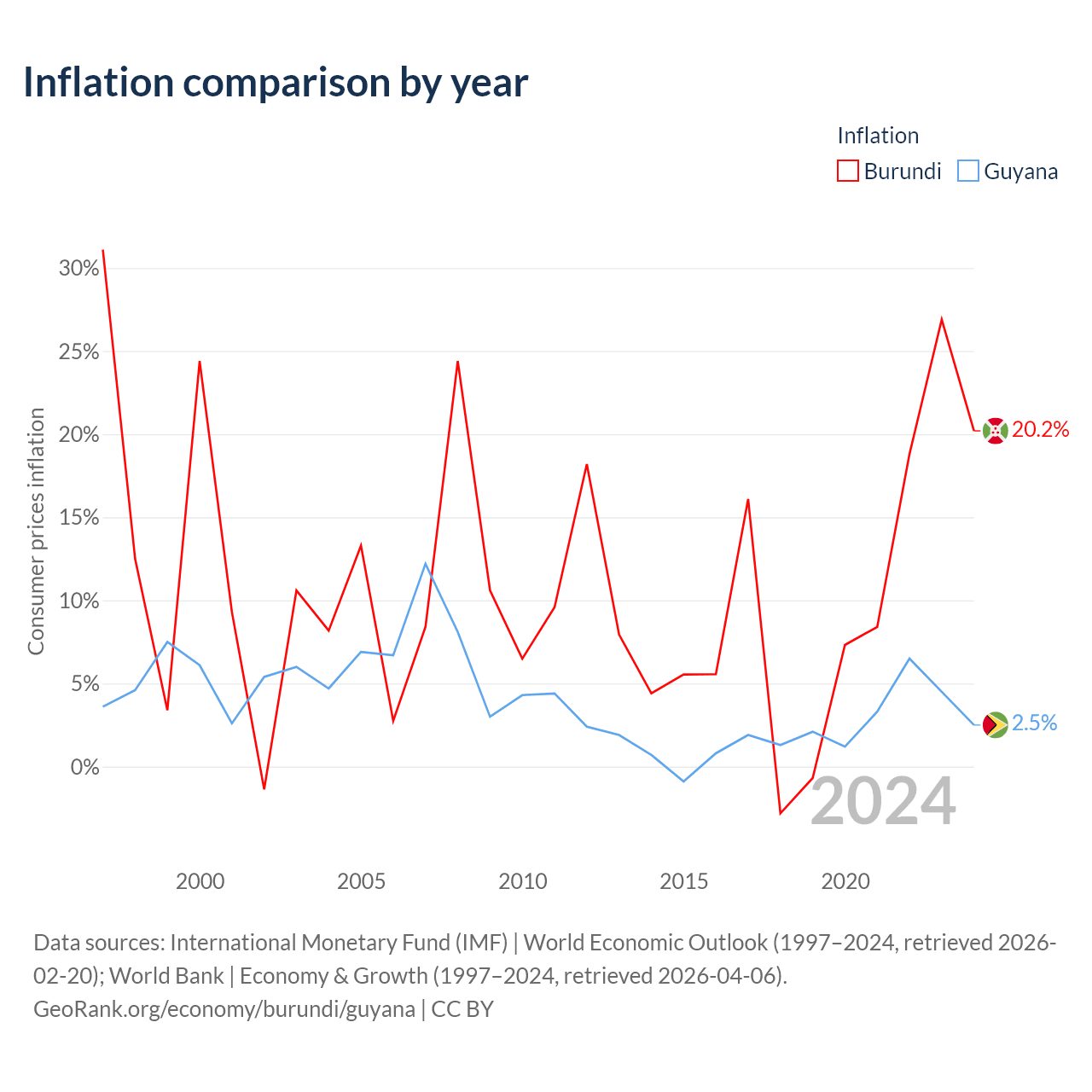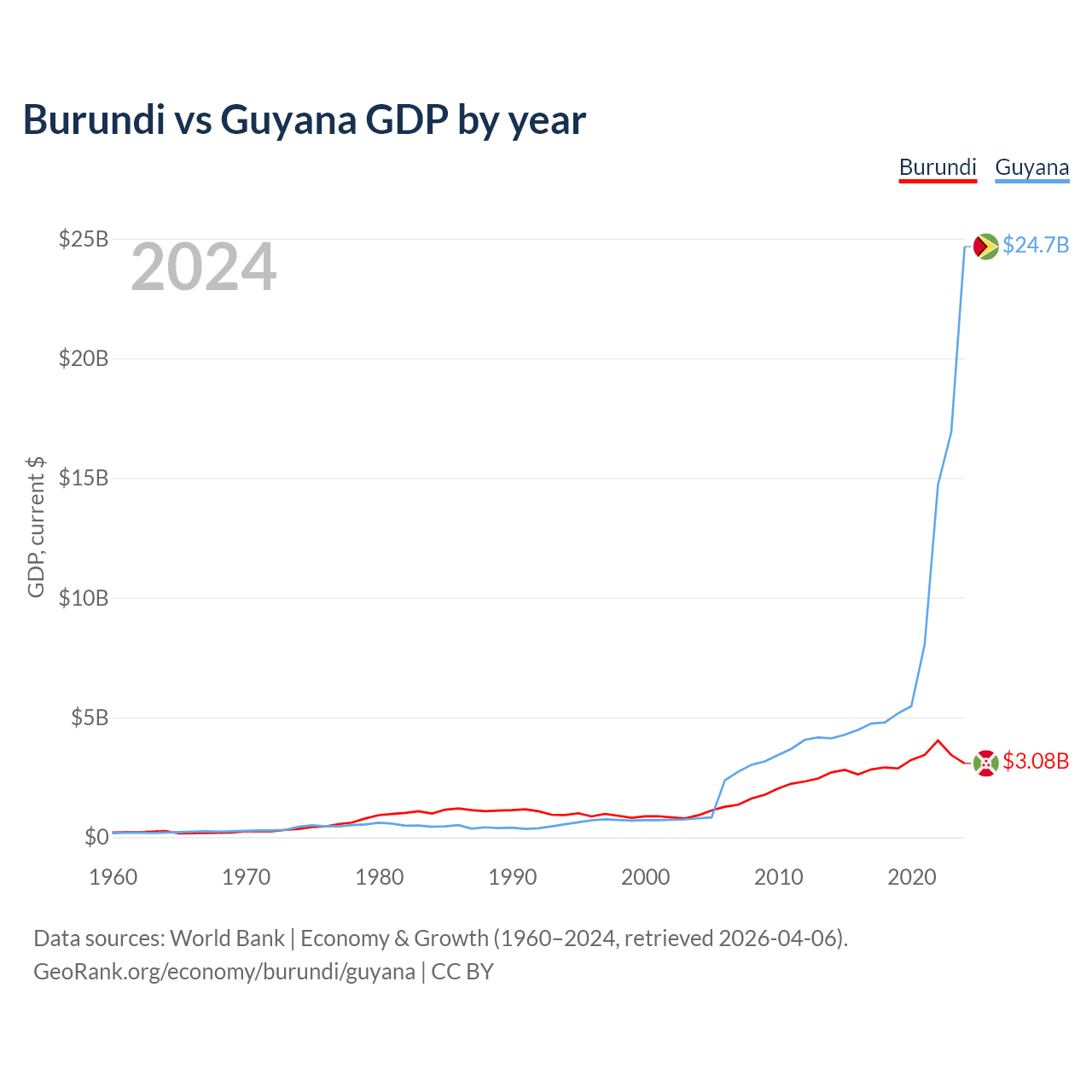 Burundi has a GDP of $3.08B compared to $24.7B for Guyana, ranking 169/197 and 120/197 by economy size, respectively.