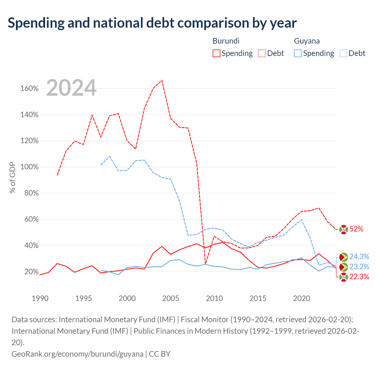 Burundi has $1.6B in government debt (52% of GDP), compared to $5.99B (24.3% of GDP) in Guyana.
