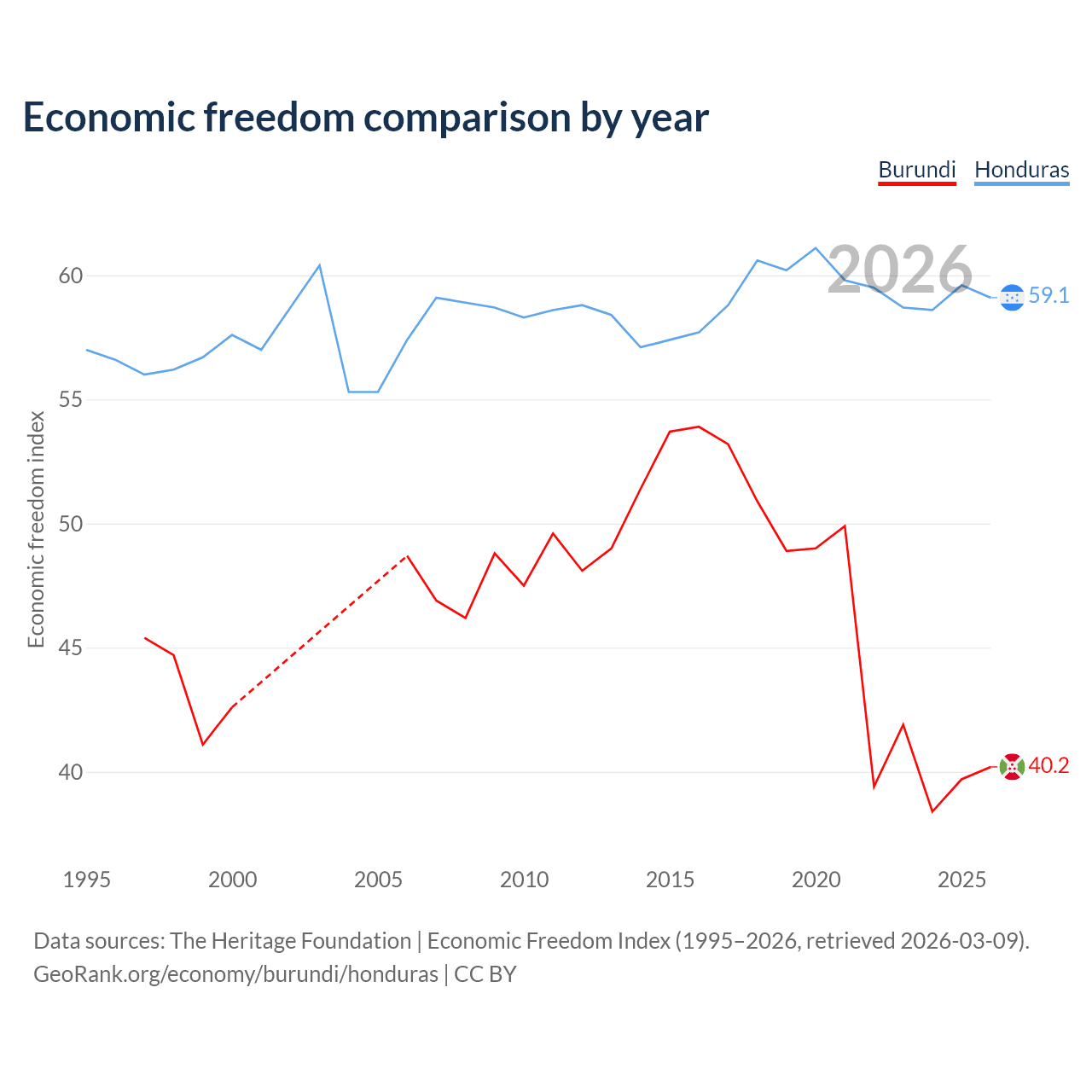 The Economic Freedom Index for Burundi is 40.2, ranking 187/197, compared to 59.1 for Honduras, ranking 105/197. The chart above displays a comparison of annual changes in economic freedom indexes.