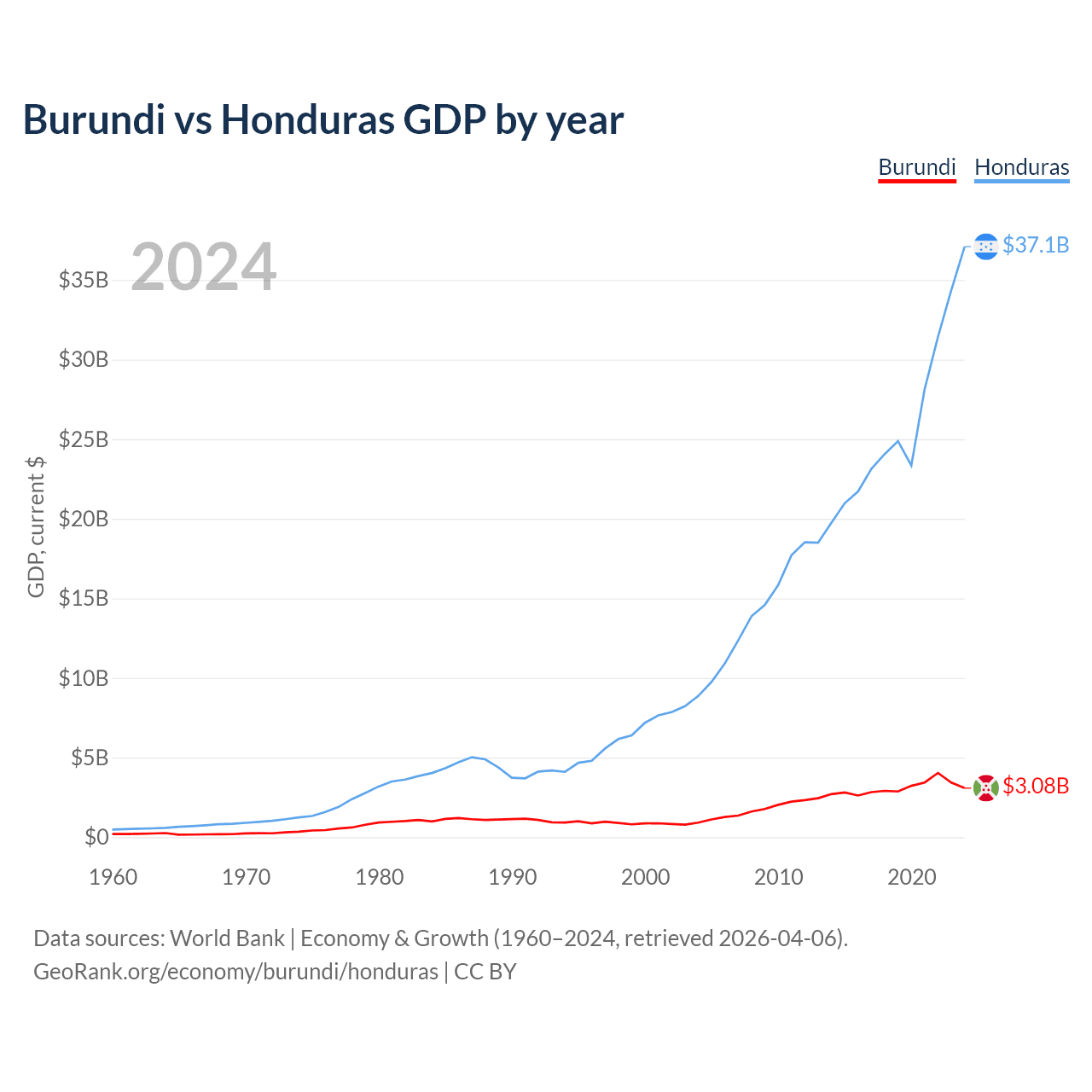 Burundi has a GDP of $3.08B compared to $37.1B for Honduras, ranking 169/197 and 104/197 by economy size, respectively.