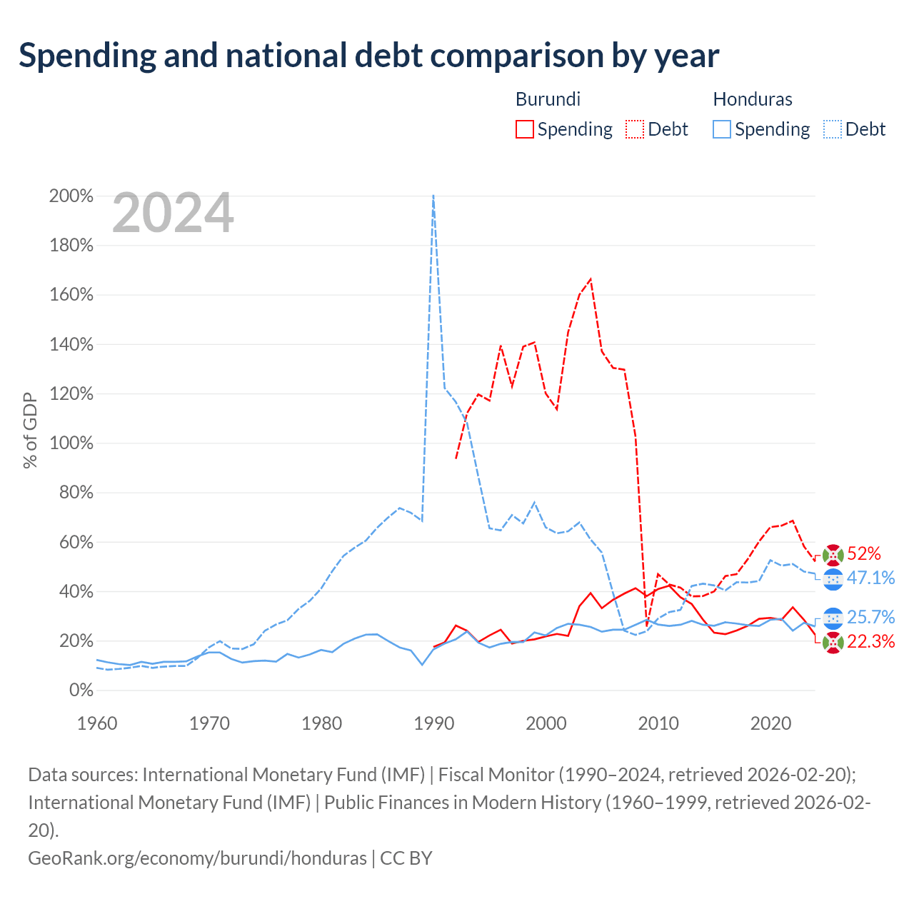 Burundi has $1.6B in government debt (52% of GDP), compared to $17.5B (47.1% of GDP) in Honduras.