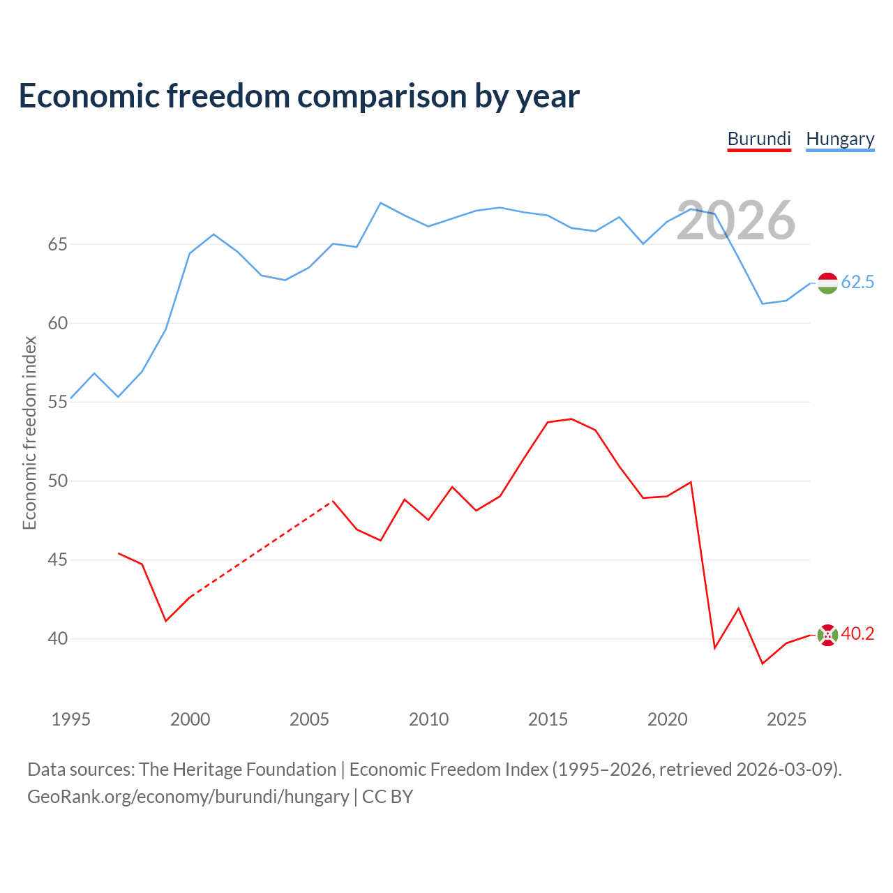 The Economic Freedom Index for Burundi is 40.2, ranking 187/197, compared to 62.5 for Hungary, ranking 86/197. The chart above displays a comparison of annual changes in economic freedom indexes.