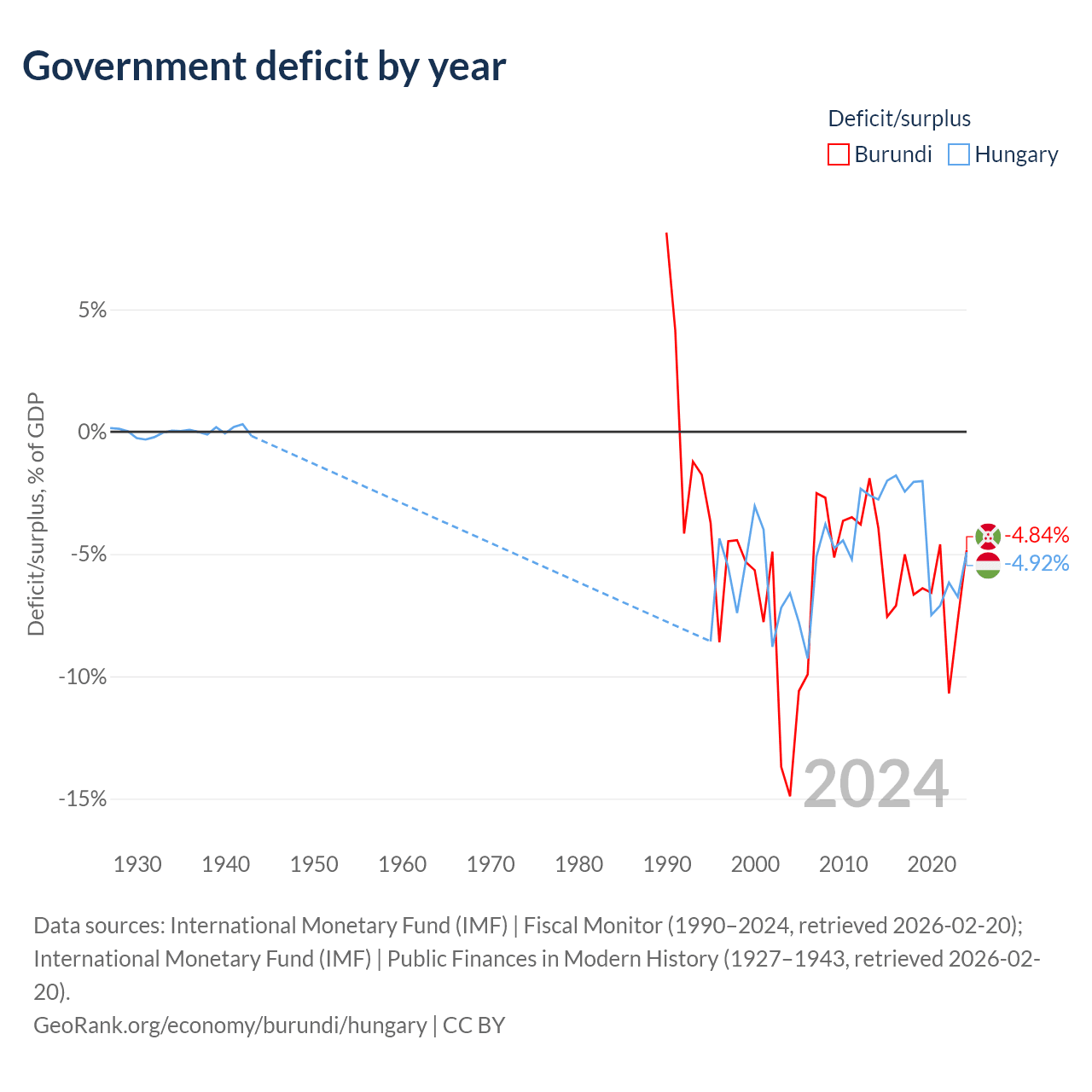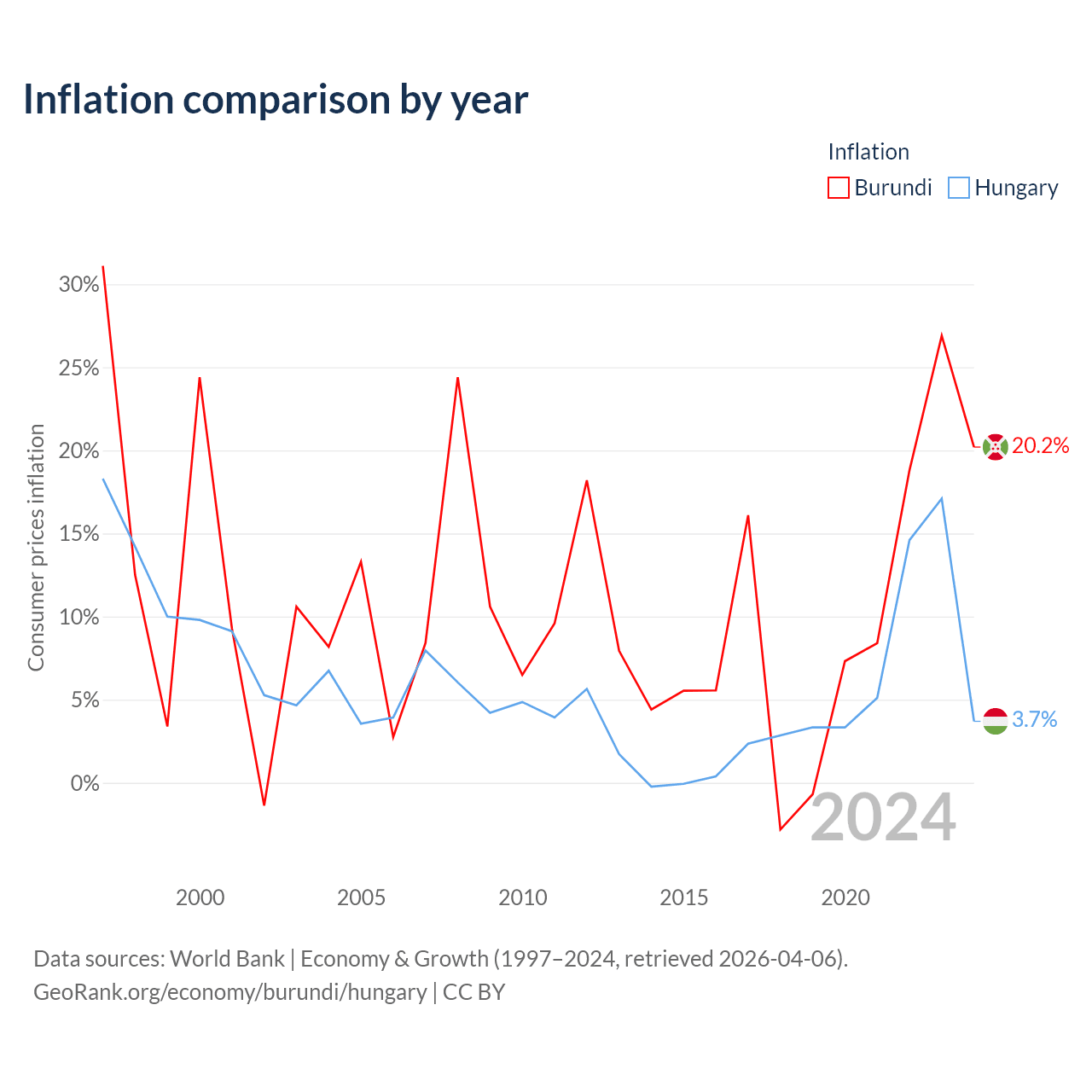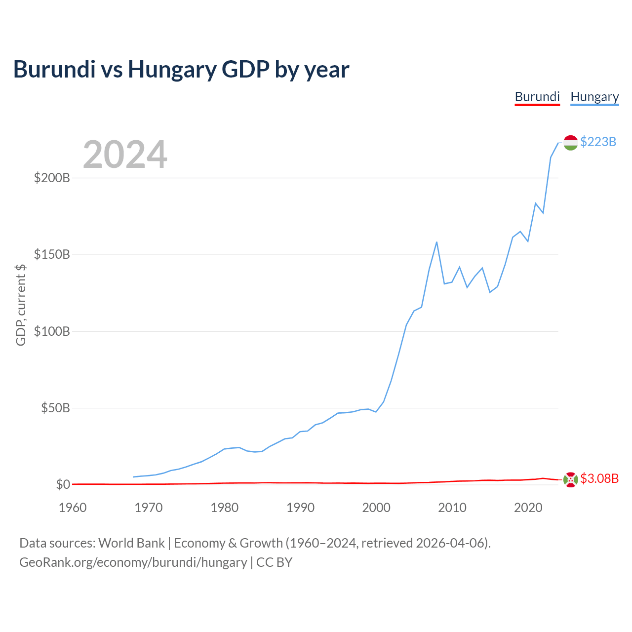 Burundi has a GDP of $3.08B compared to $223B for Hungary, ranking 169/197 and 55/197 by economy size, respectively.